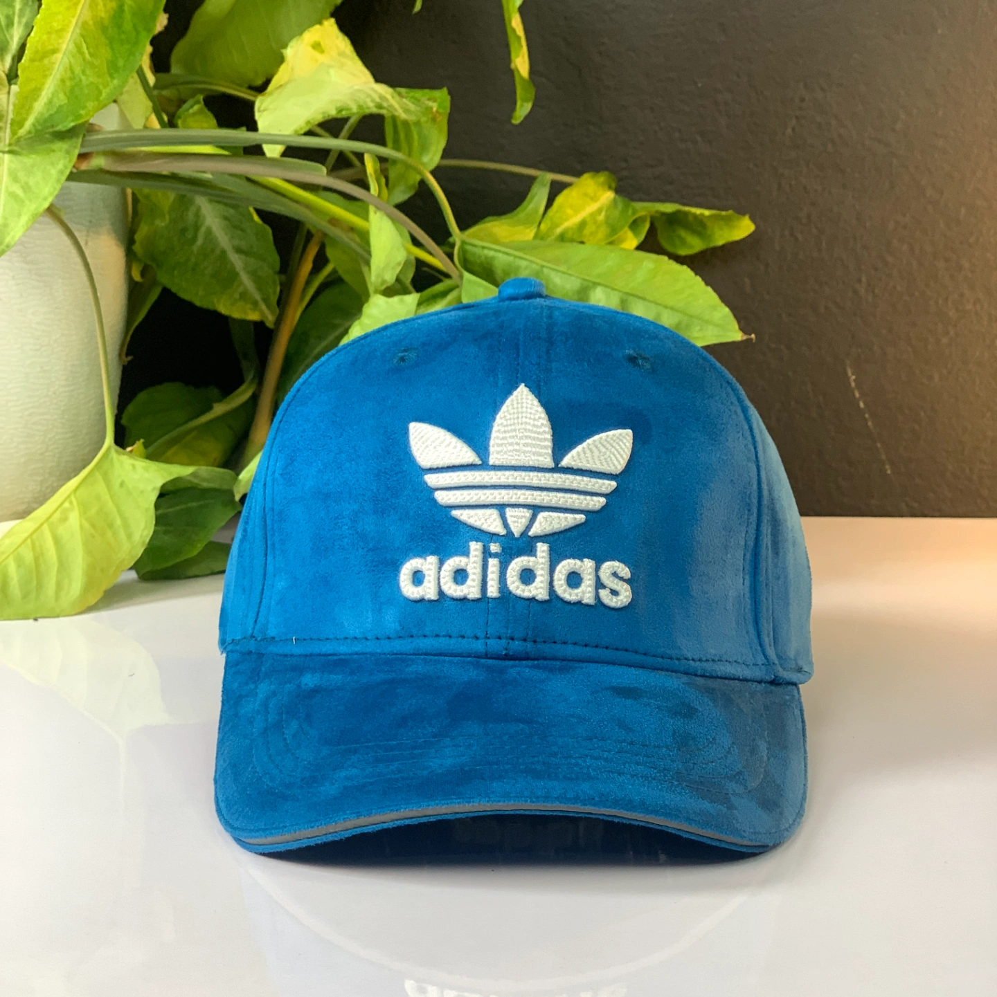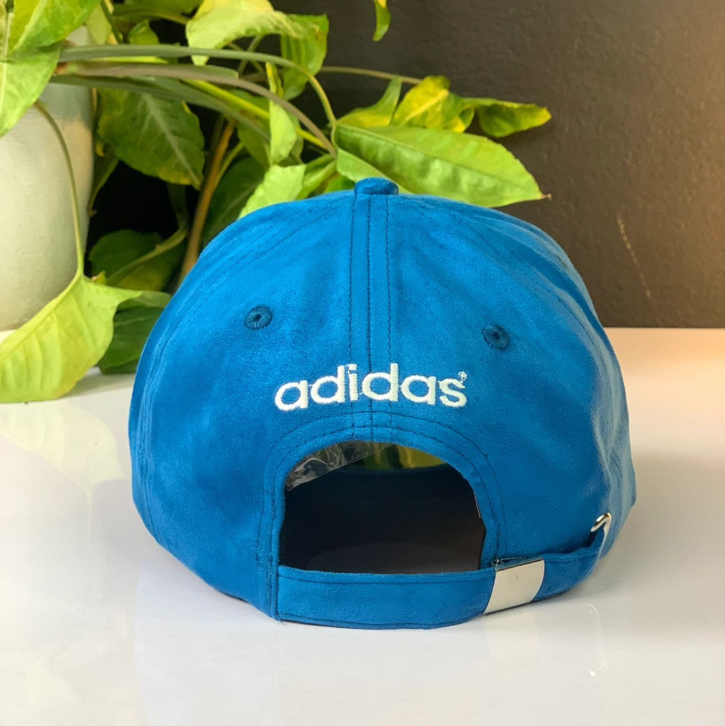 Adidas Originals relaxed strap-back baseball cap in a blue suede-like material with a white embroidered Trefoil logo.