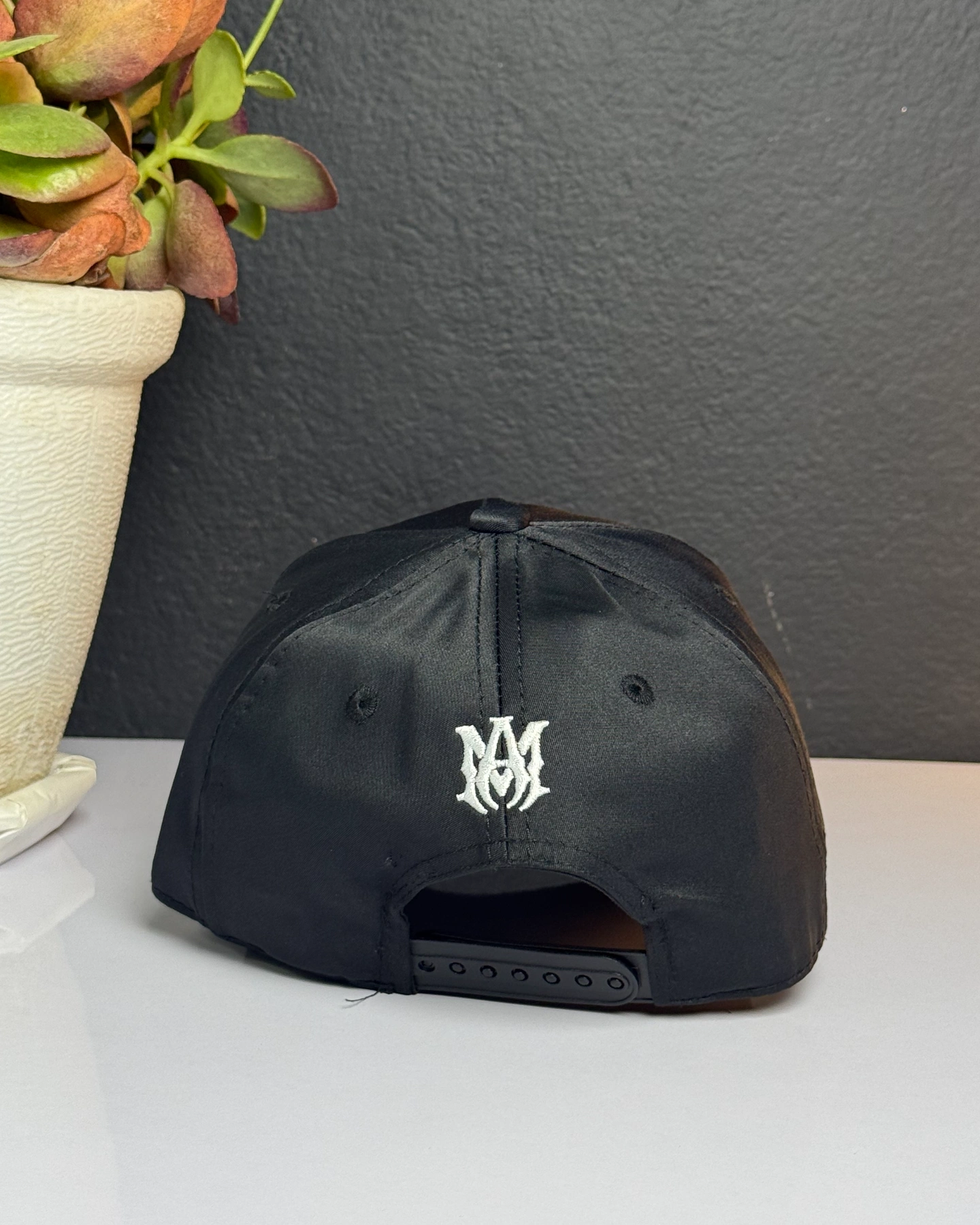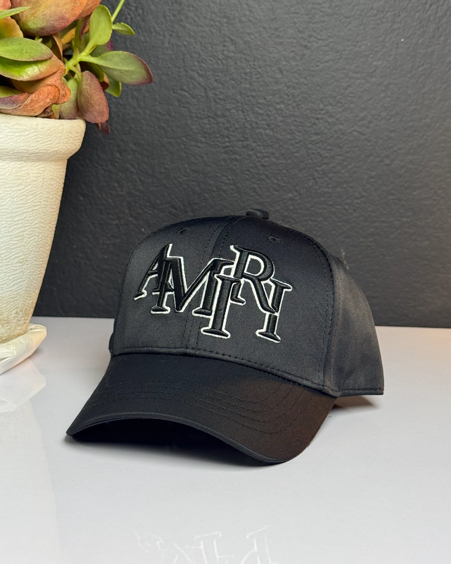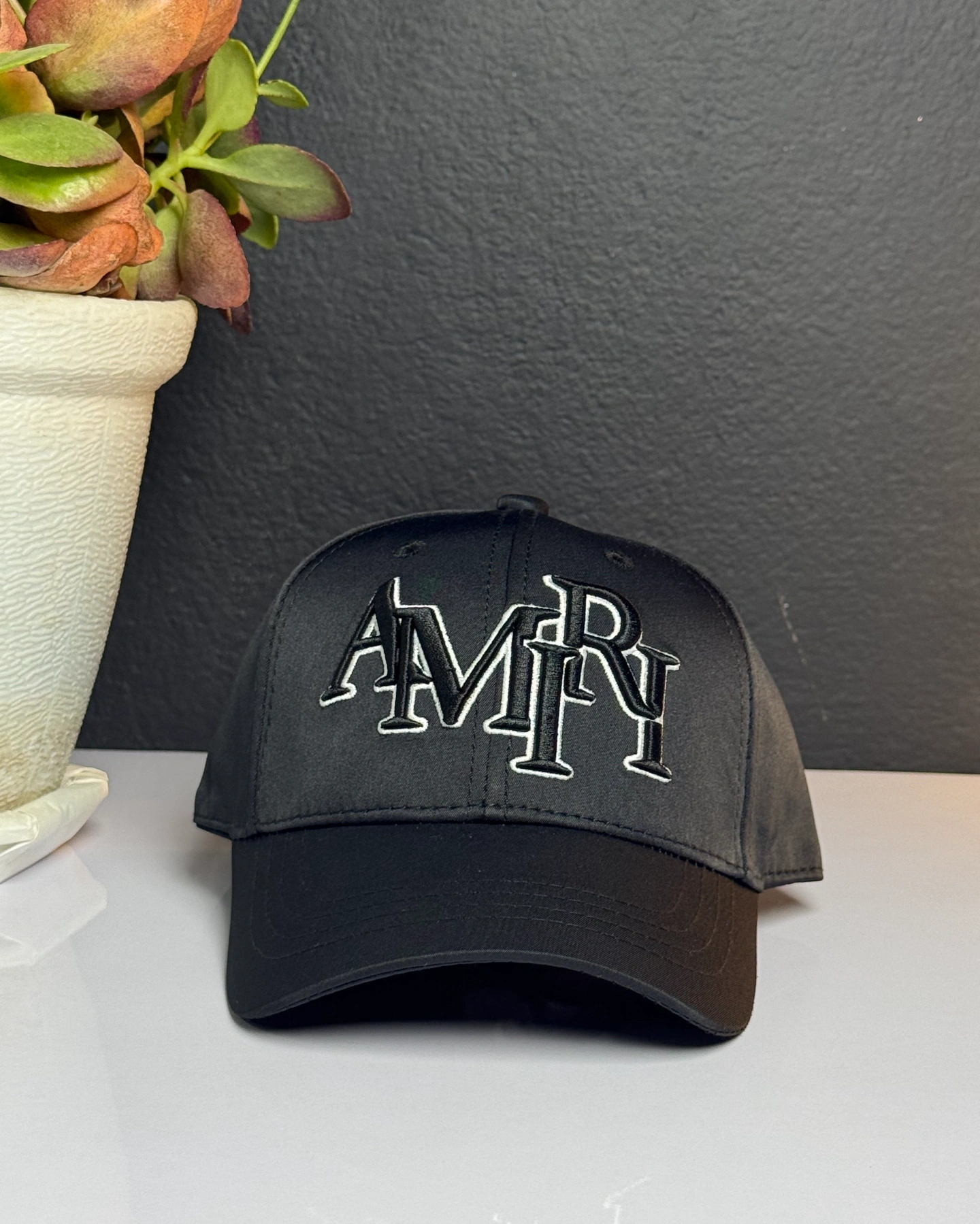 AMIRI Black Staggered Canvas Cap, a cotton baseball cap featuring an embroidered white staggered logo on the front.