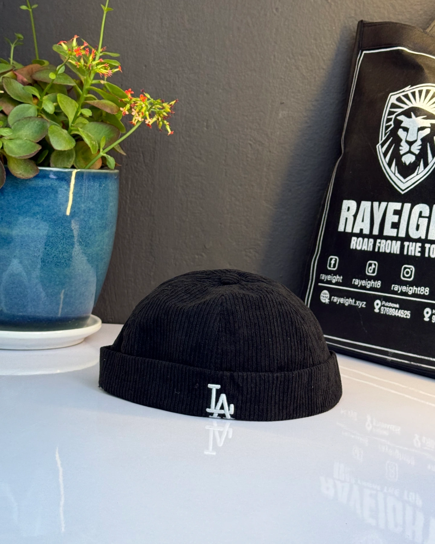 Black brimless docker hat features an embroidered Los Angeles Dodgers "LA" logo.