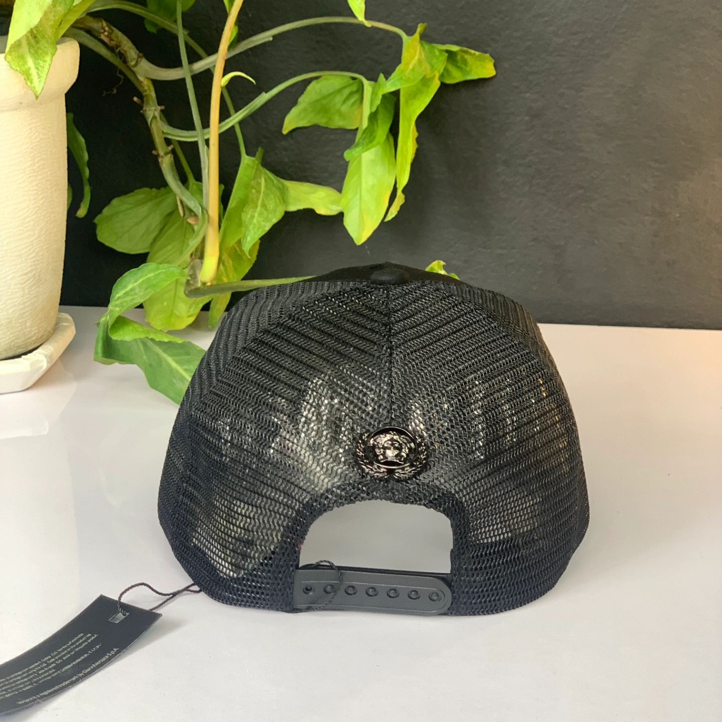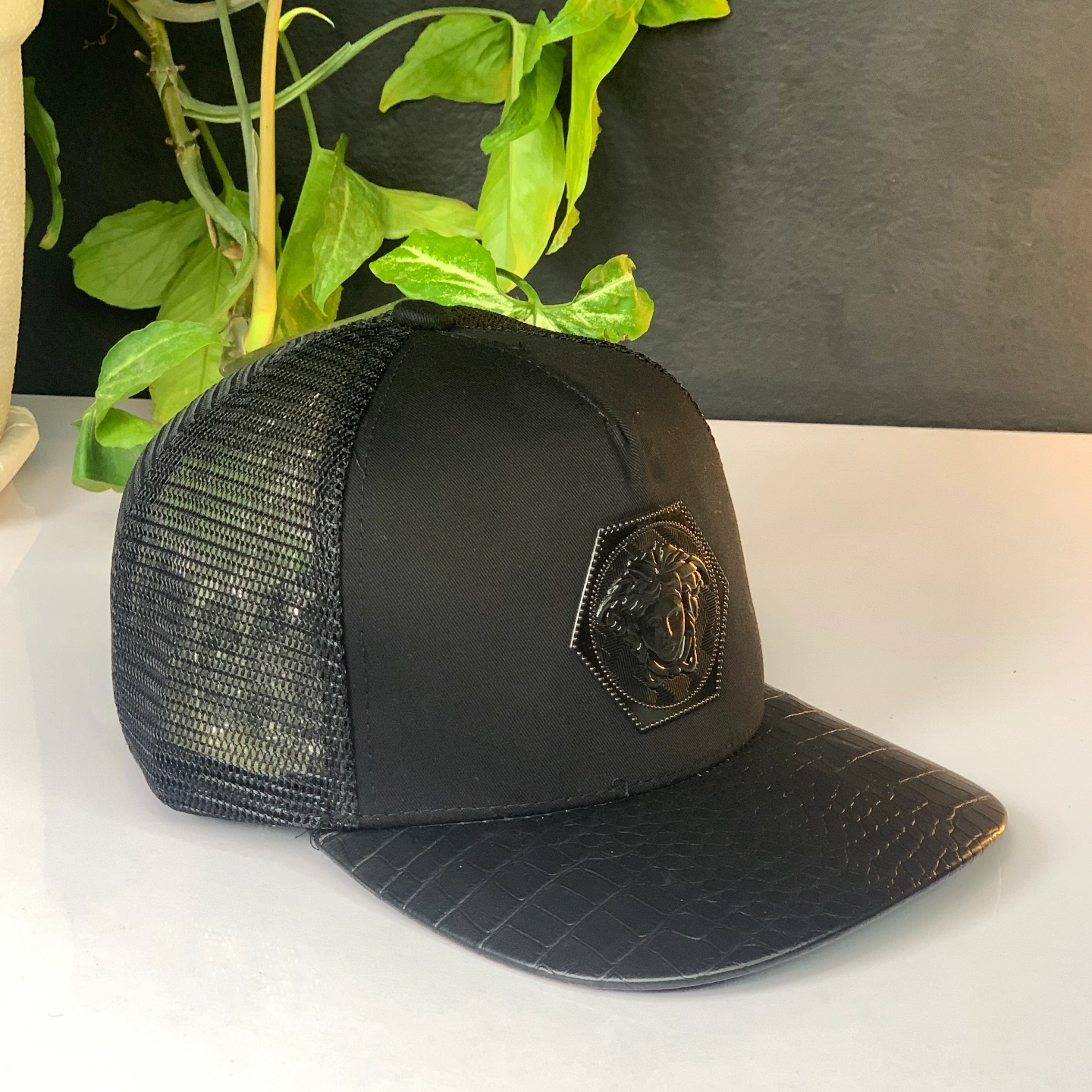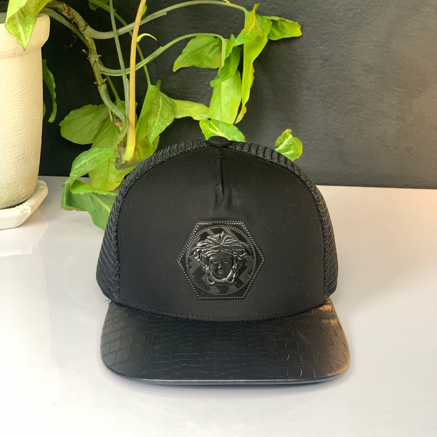 black Versace trucker cap featuring a Medusa emblem on the front and a faux leather brim