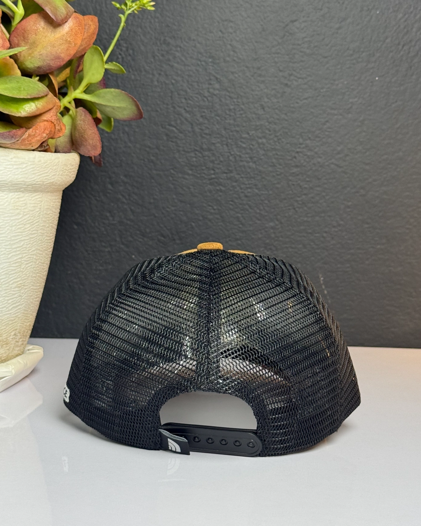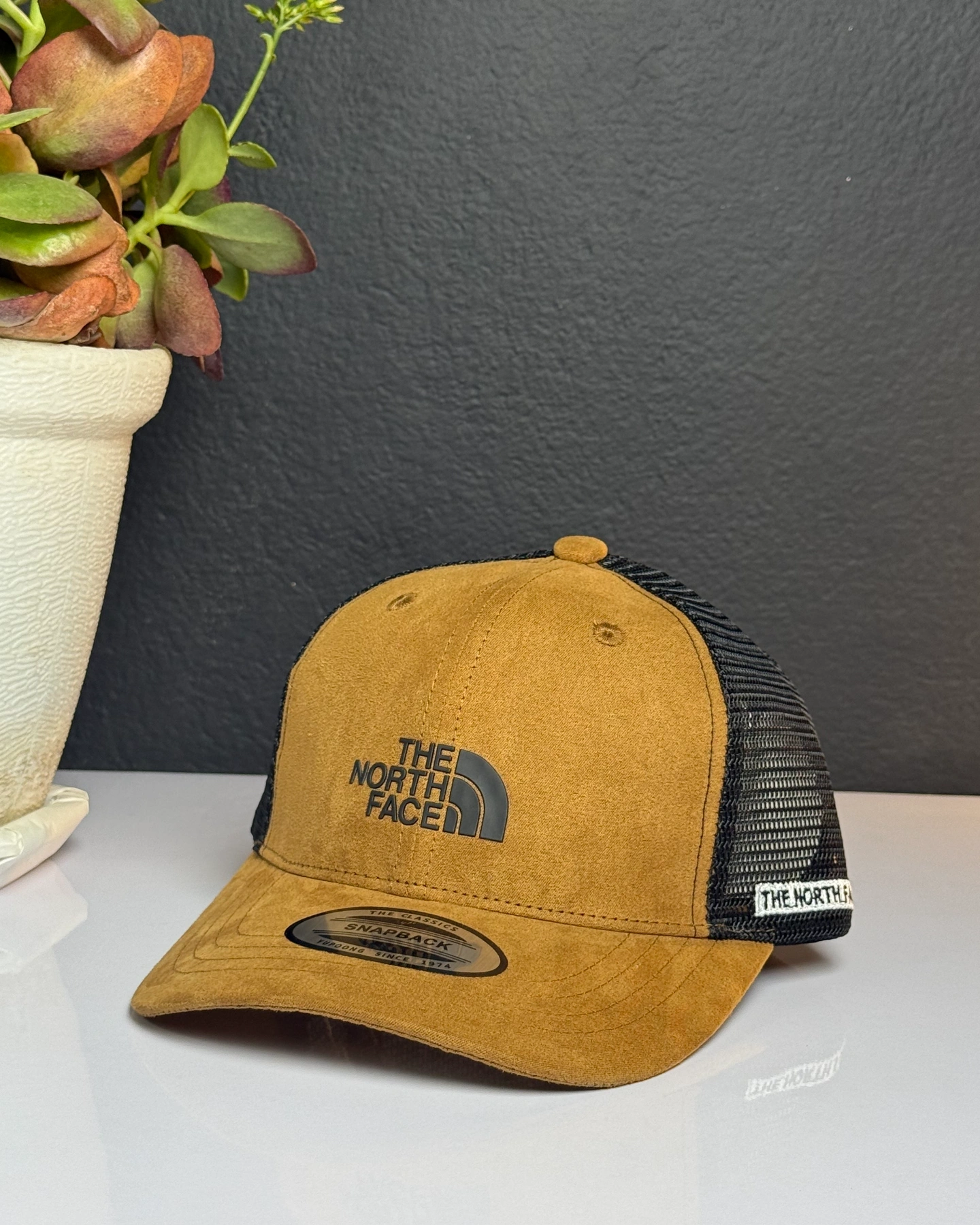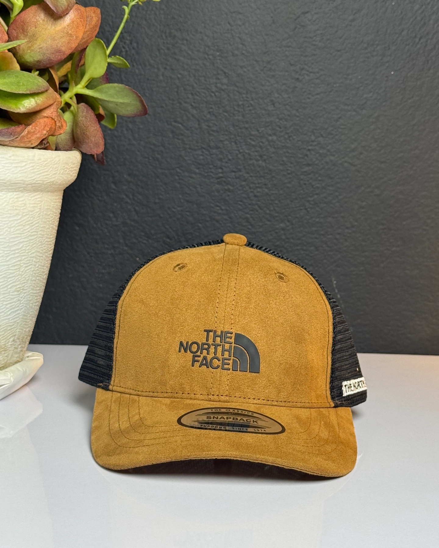 Brown suede and black mesh The North Face Mudder Trucker Hat.