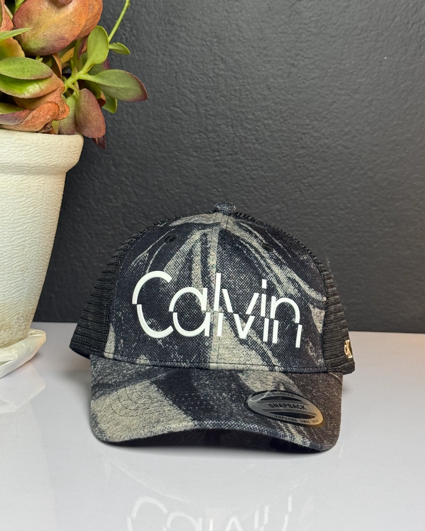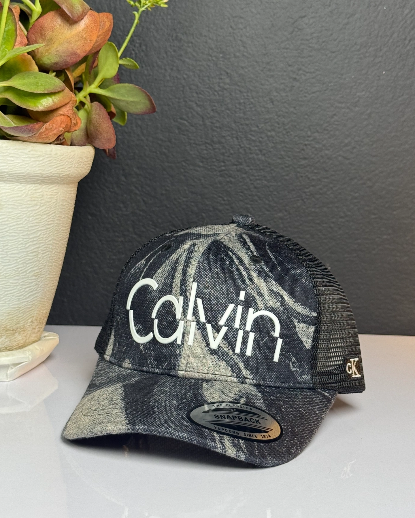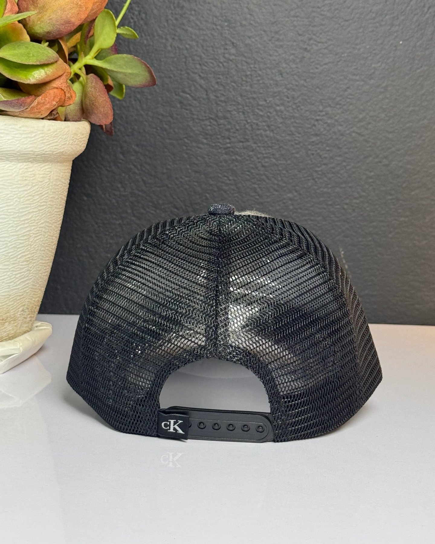 Calvin Klein Reimagined Logo Trucker Cap, featuring a mesh back and adjustable snapback closure