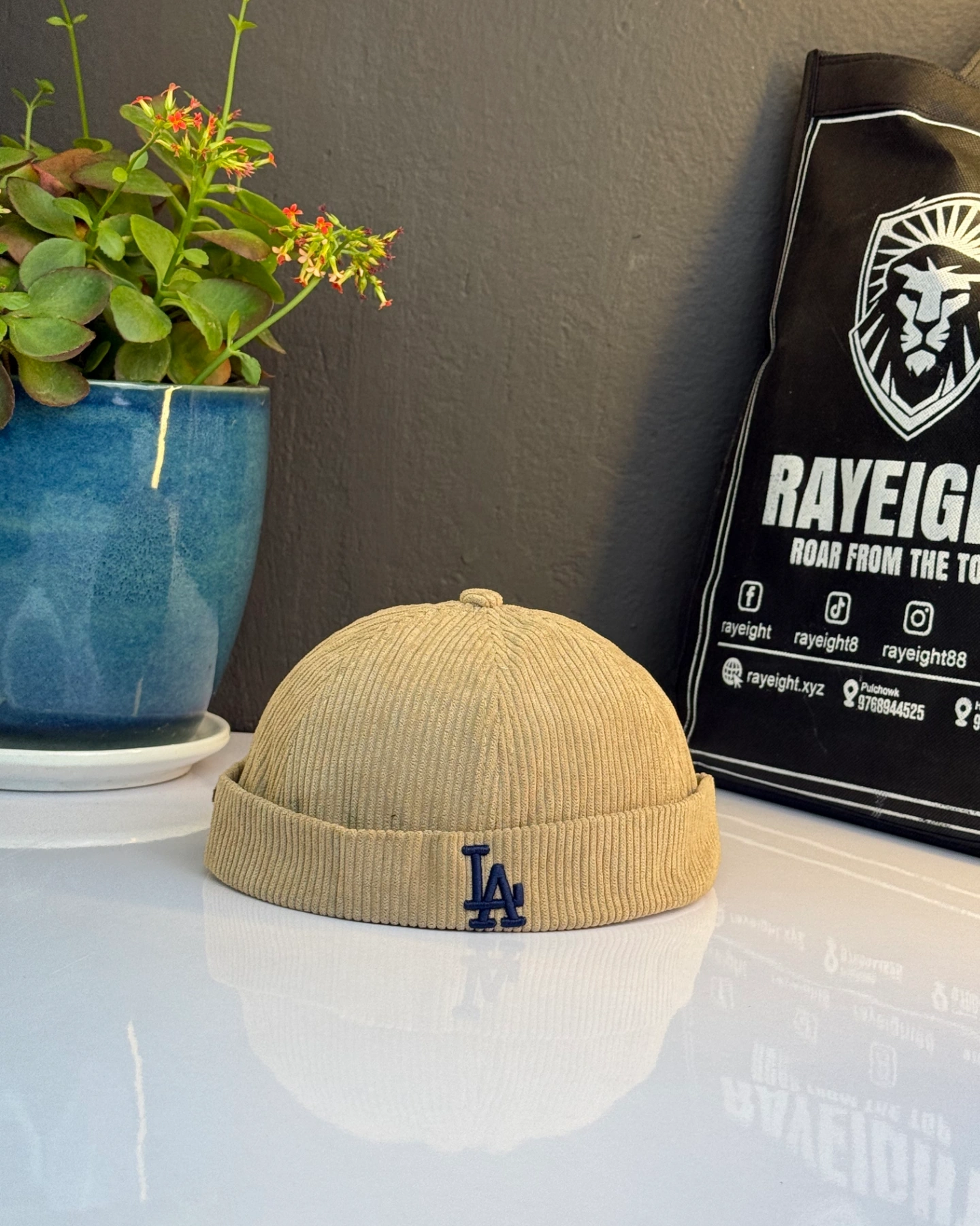 Camel brimless docker hat features an embroidered Los Angeles Dodgers "LA" logo.