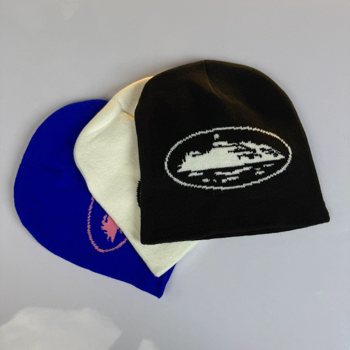 Corteiz Alcatraz Skully beanie in black, cream, and royal blue