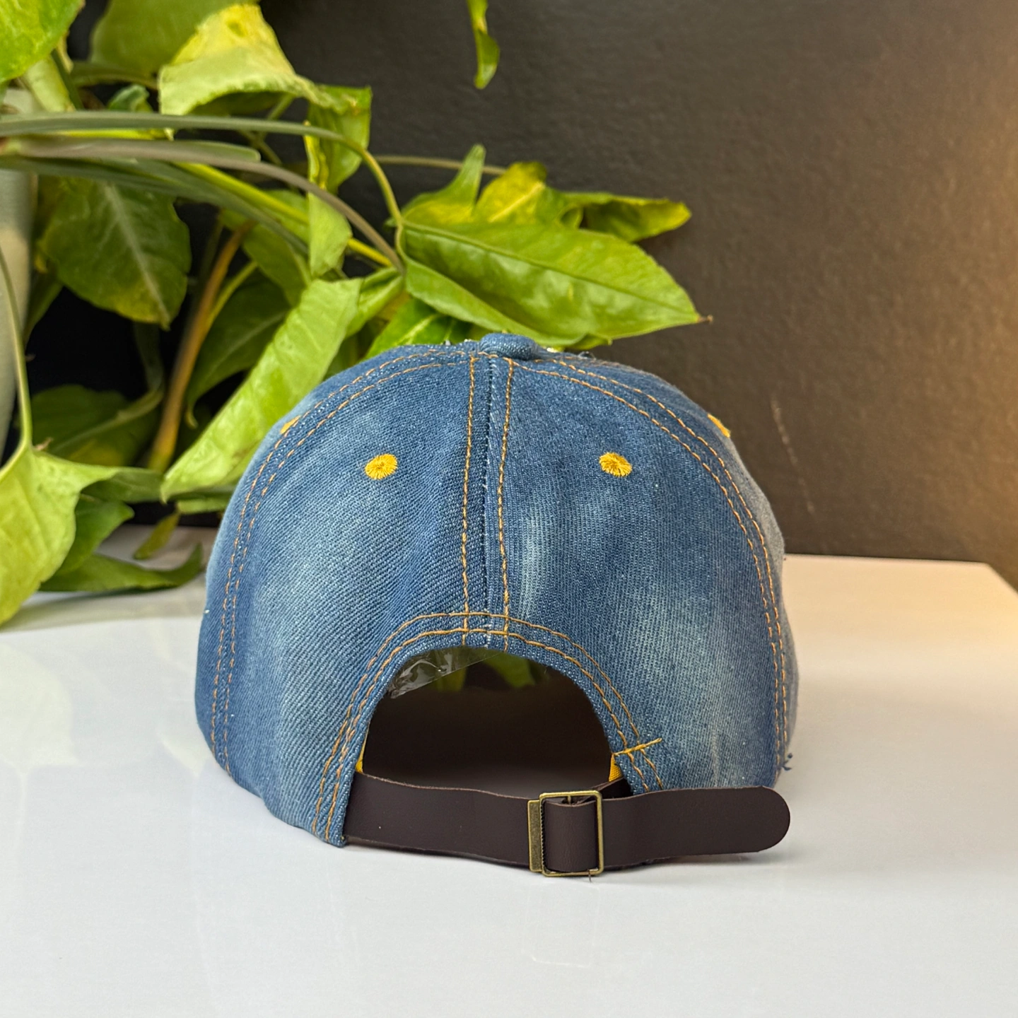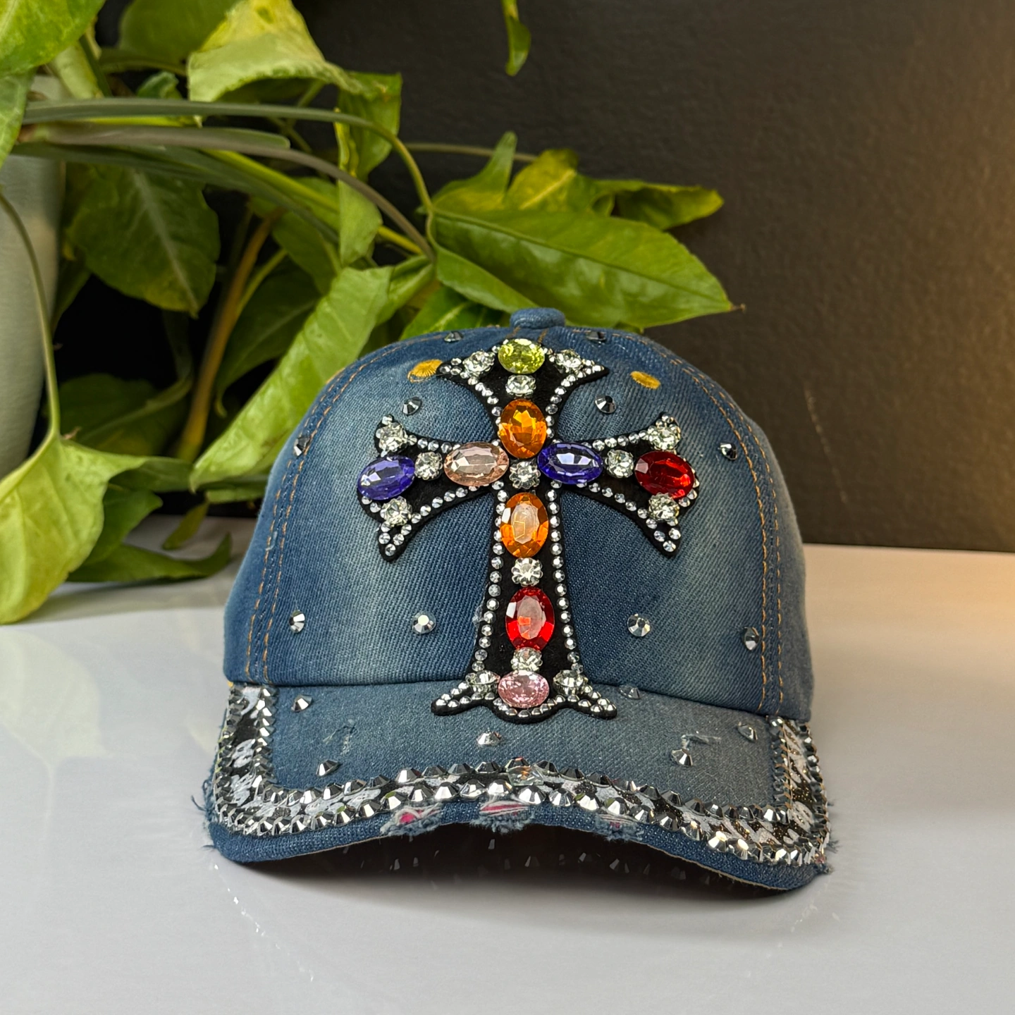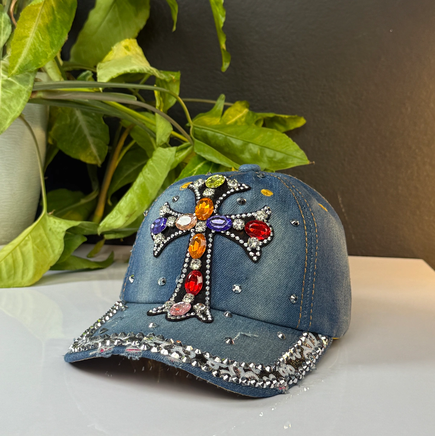 women's denim baseball cap with a multi-colored rhinestone cross design.