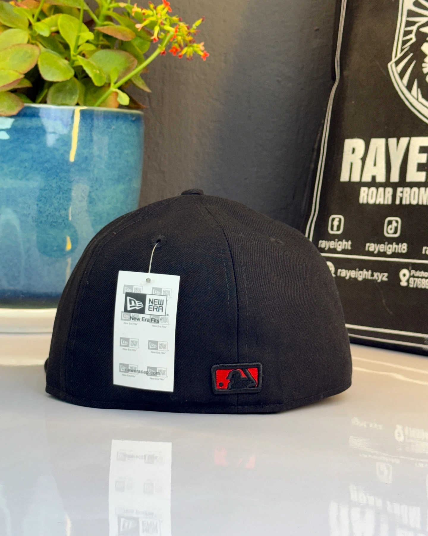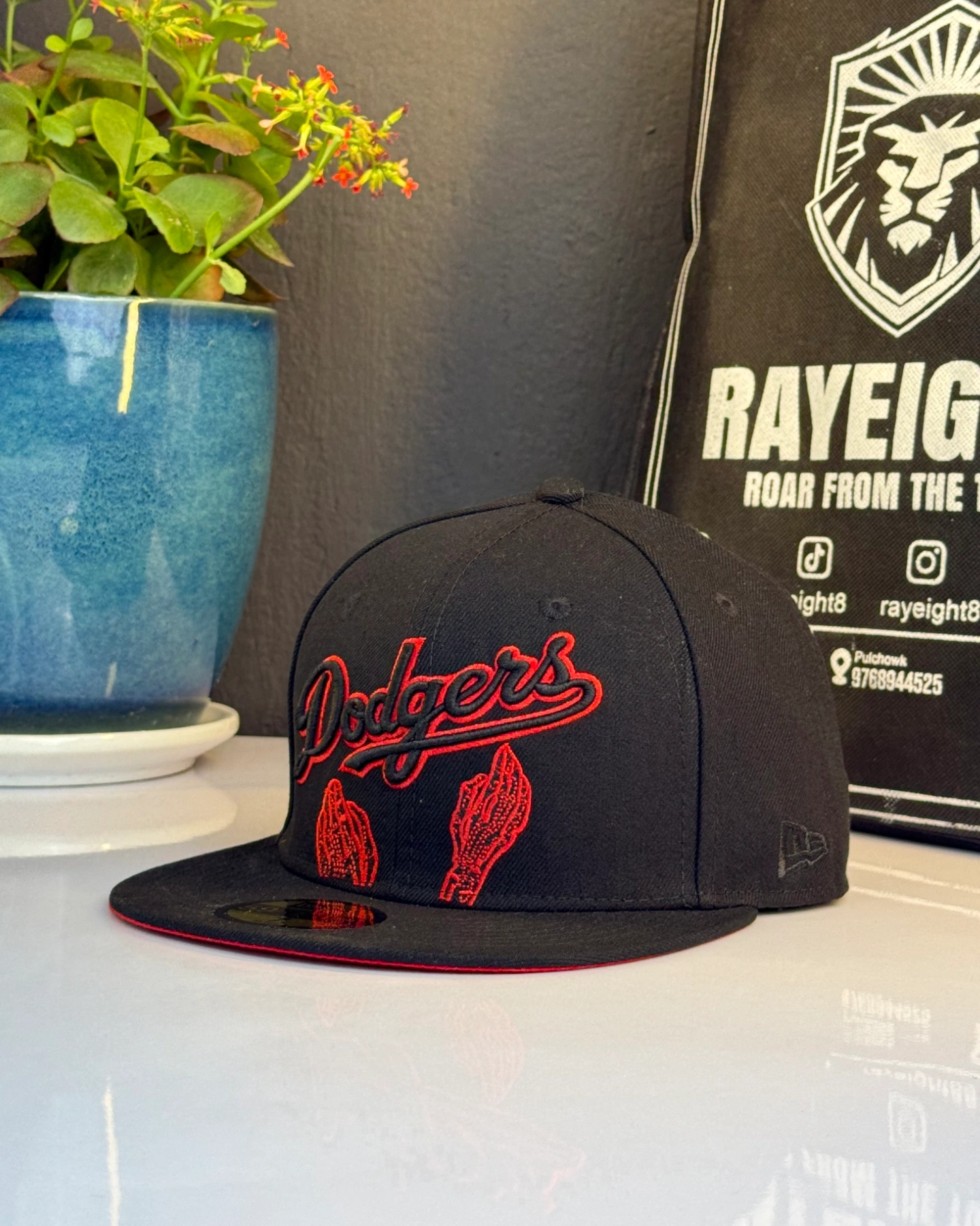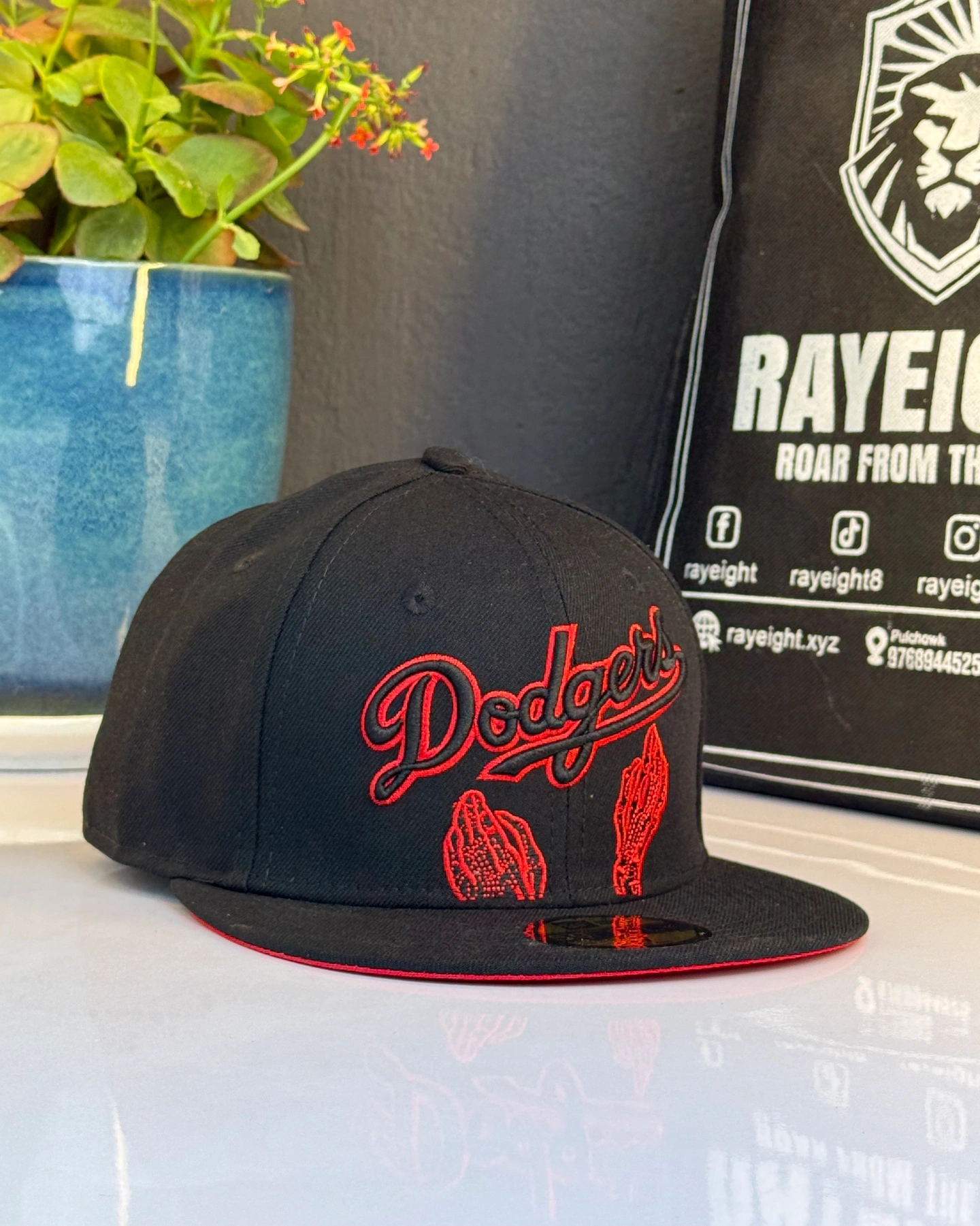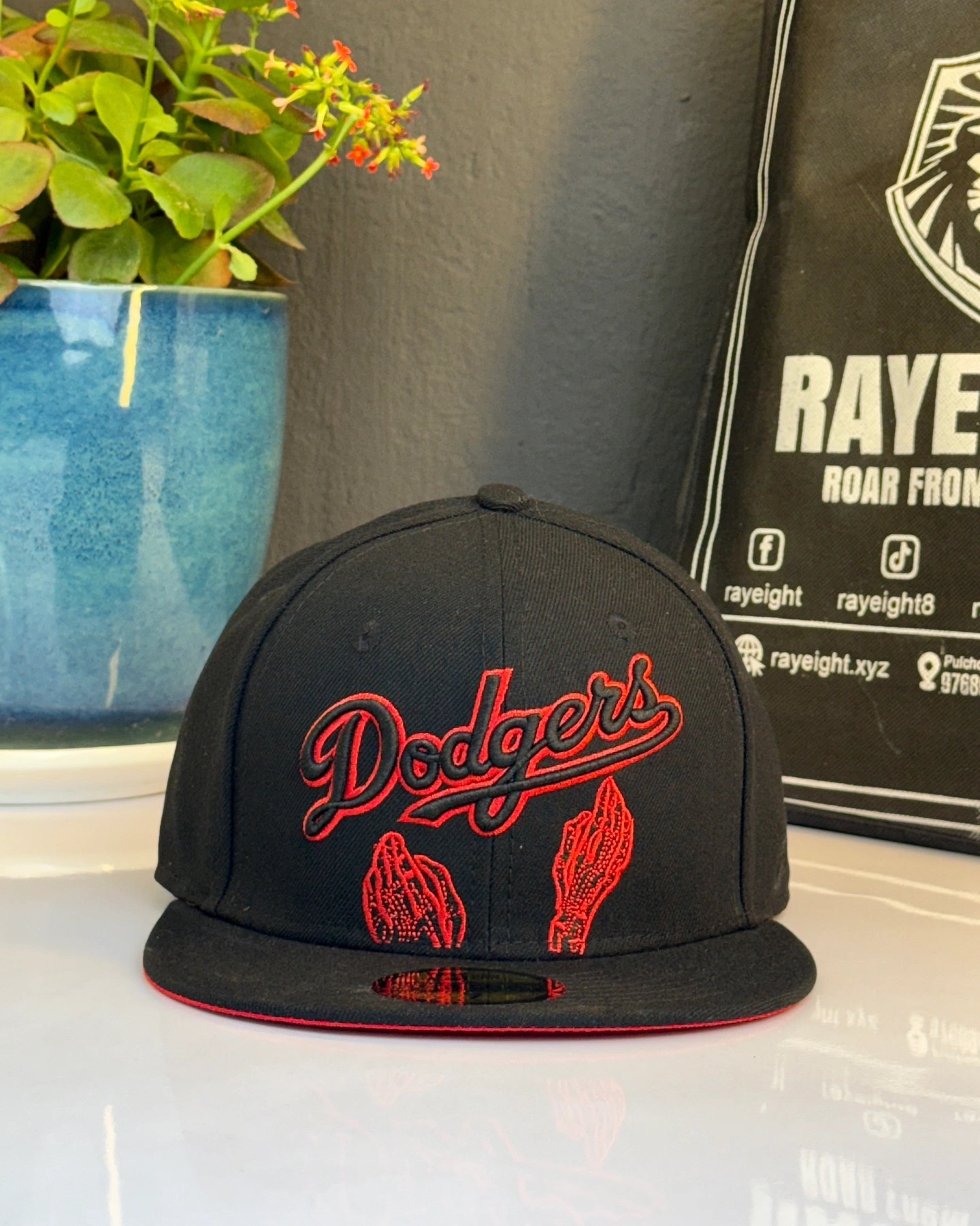 Dodgers baseball cap featuring a red embroidered script logo and unique hand graphics.