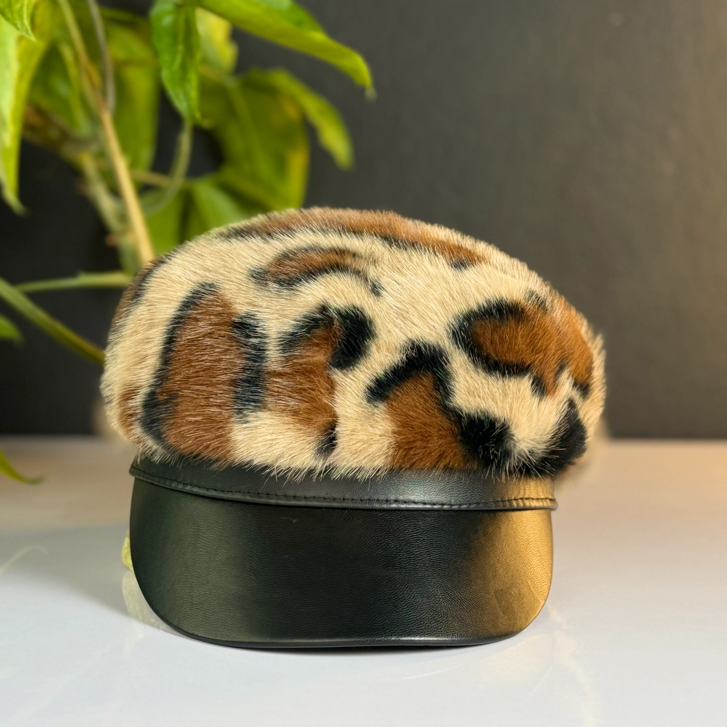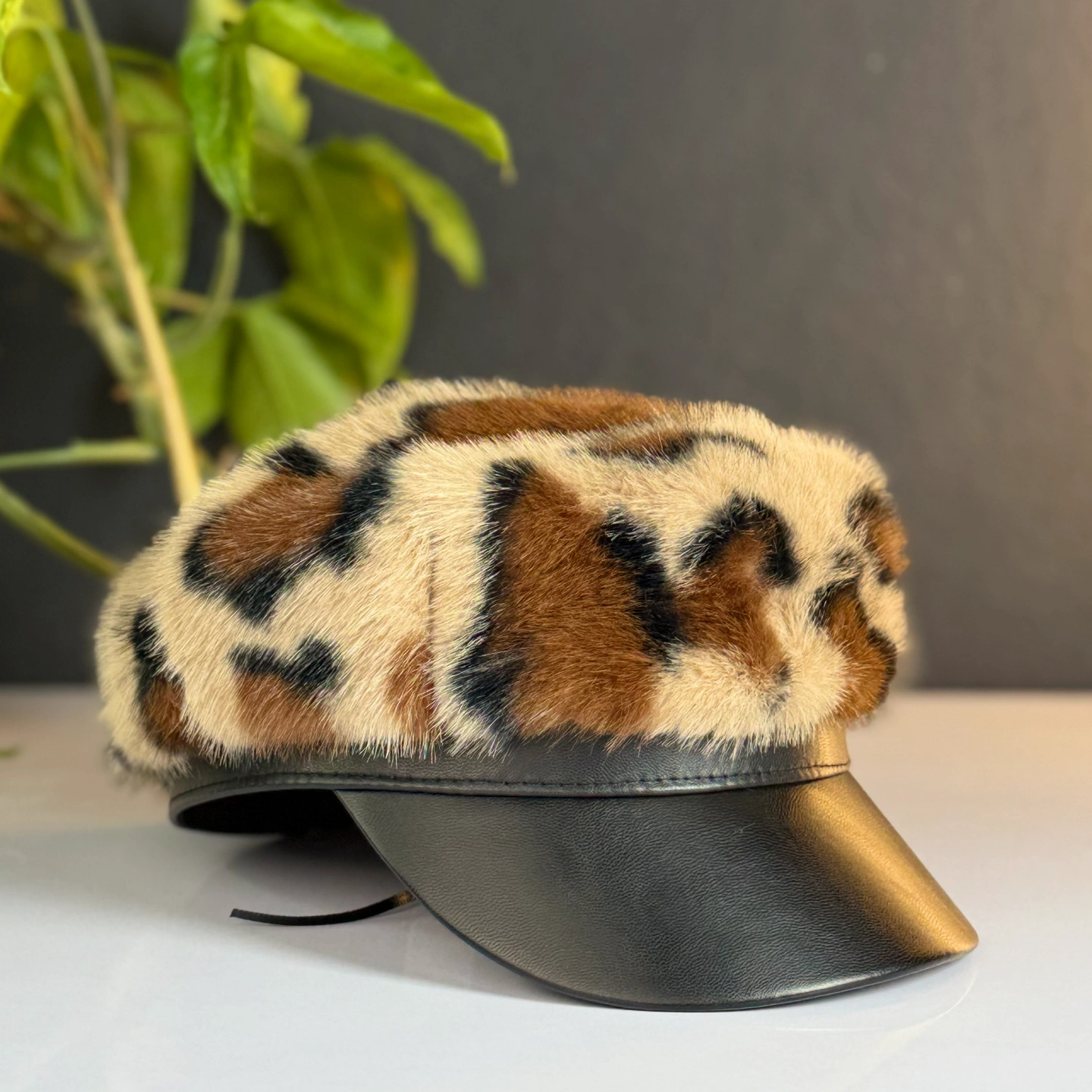 Dolce & Gabbana natural fur and leather brim newsboy hat.