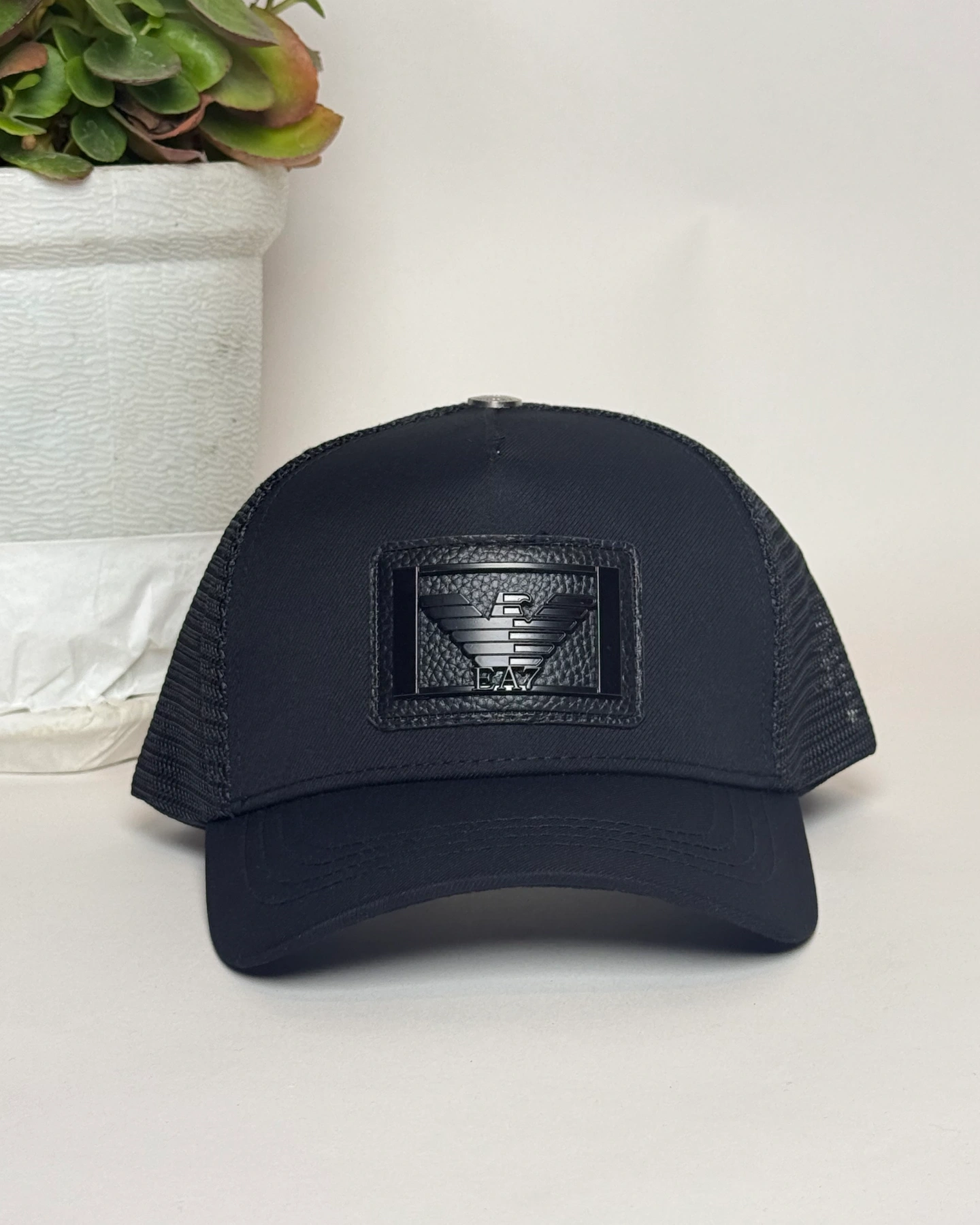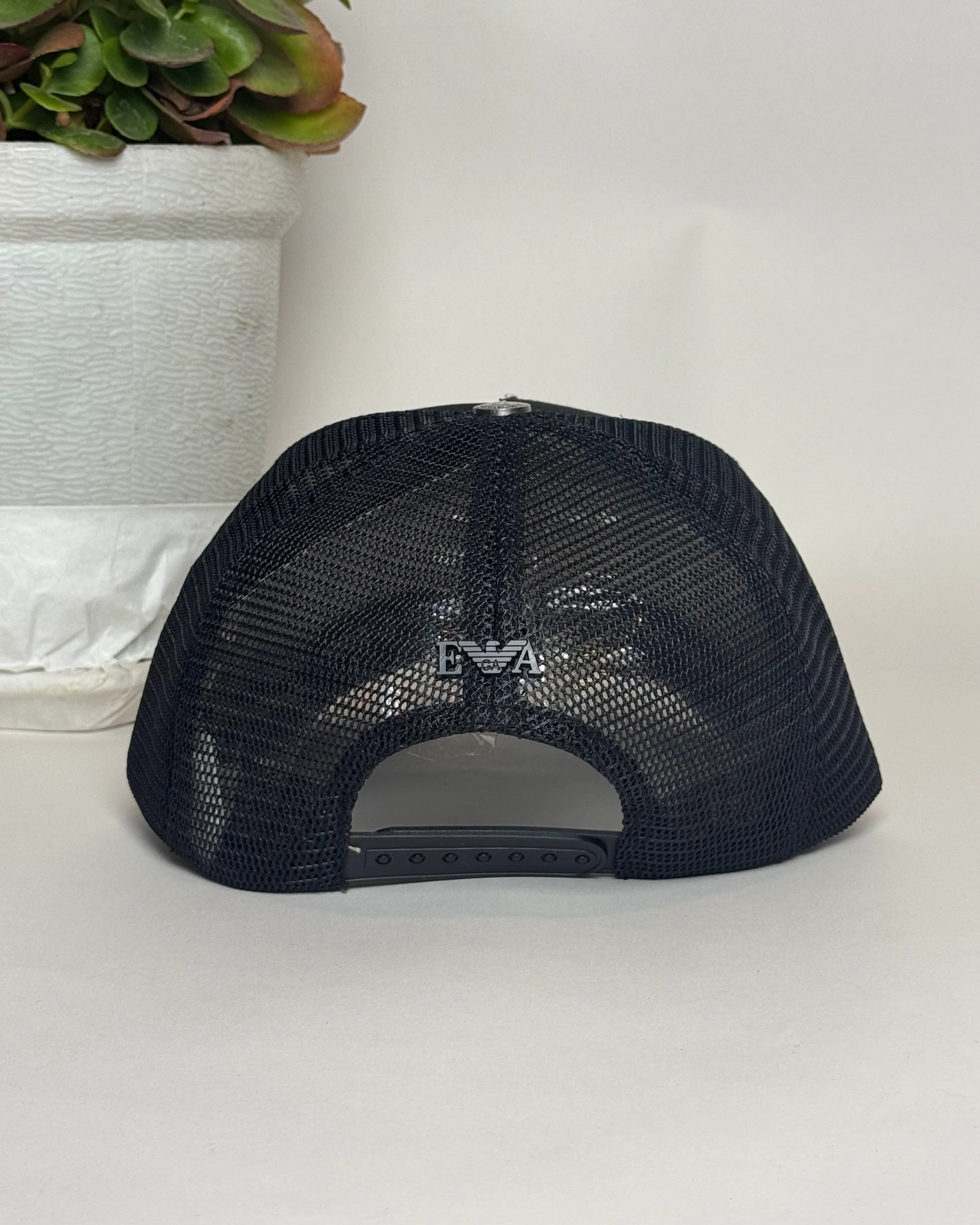 Emporio Armani black baseball cap featuring an iconic eagle logo patch.
