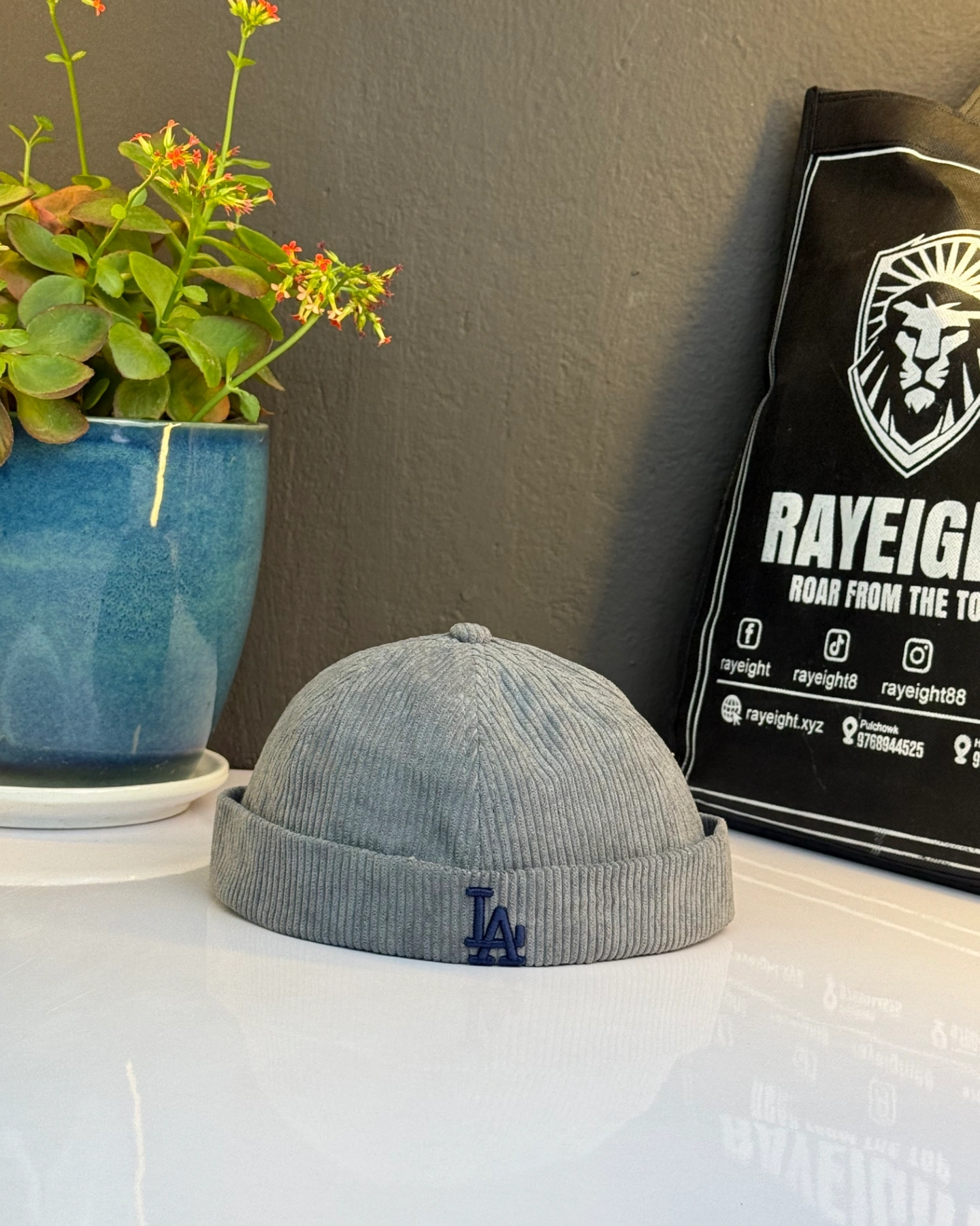 Grey brimless docker hat features an embroidered Los Angeles Dodgers "LA" logo.