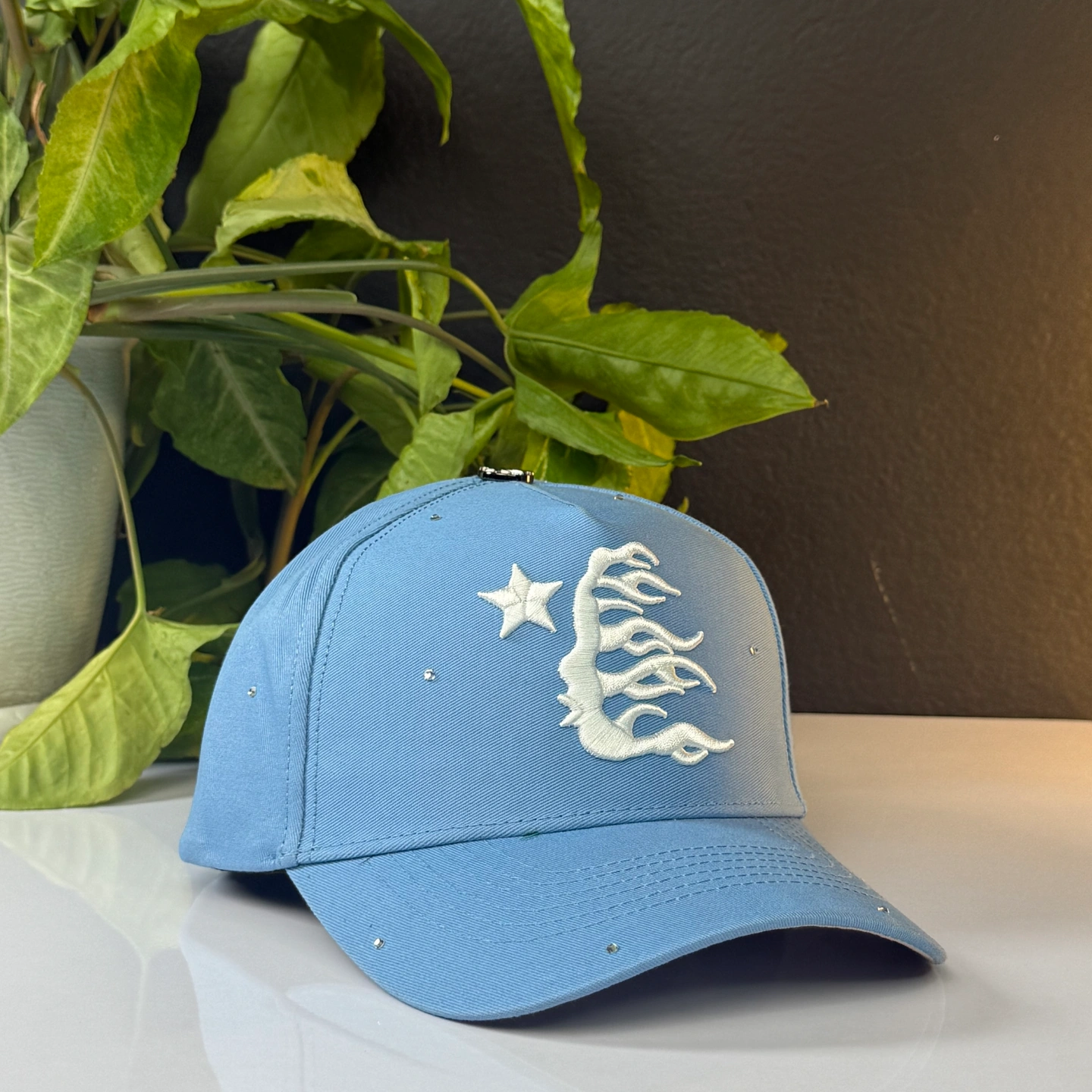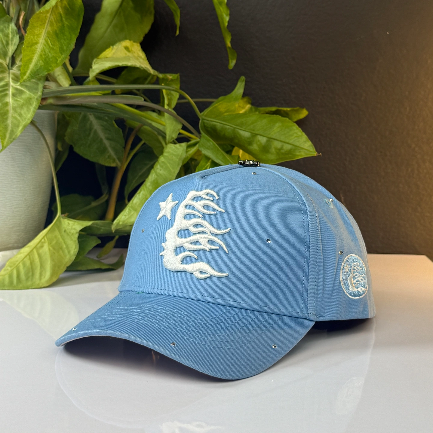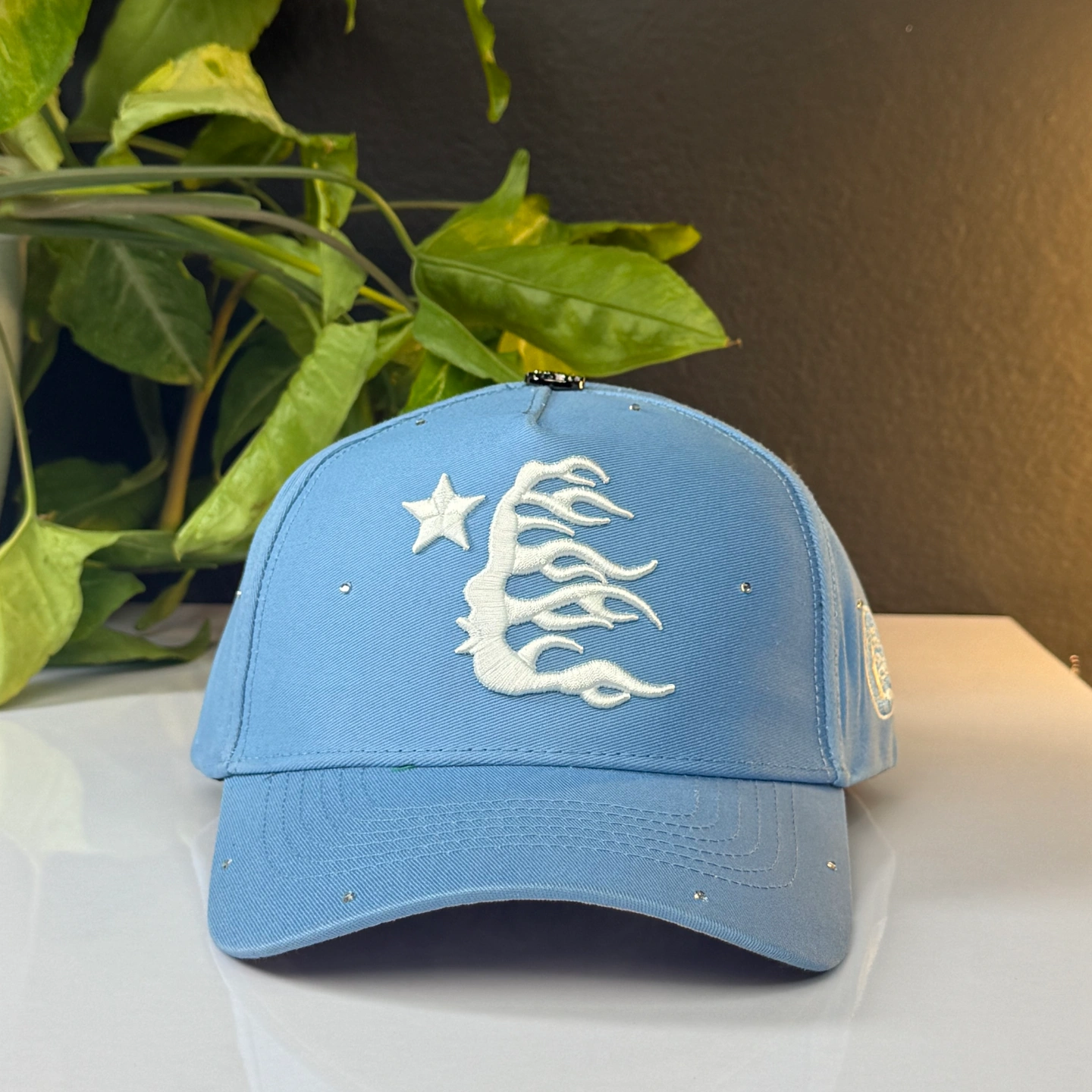 Hellstar Studios OG Logo Snapback cap in baby blue with rhinestone embellishment