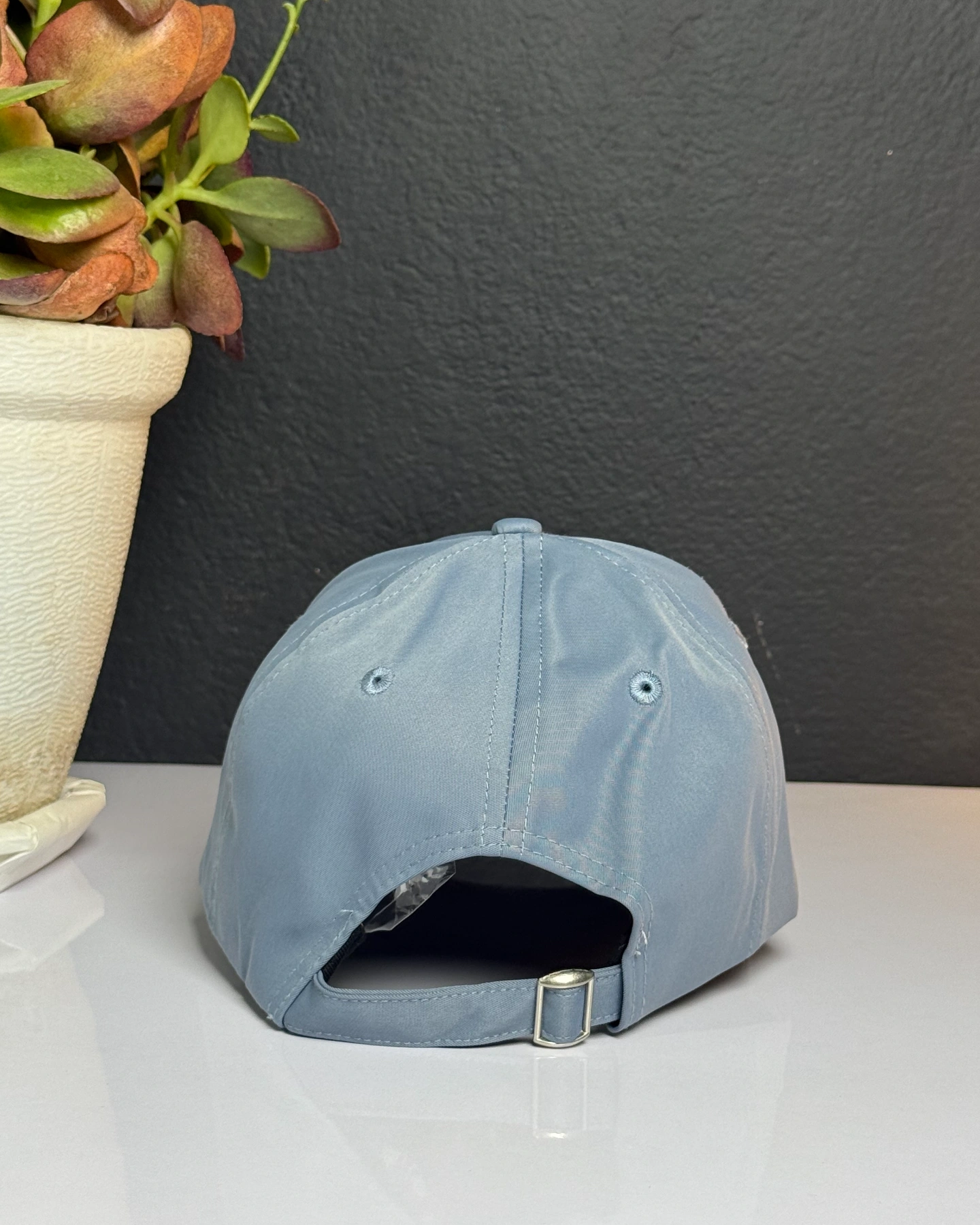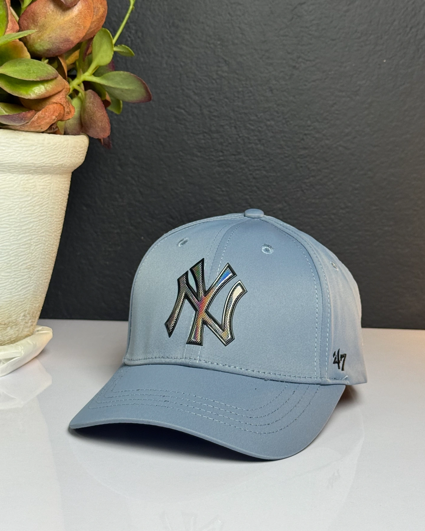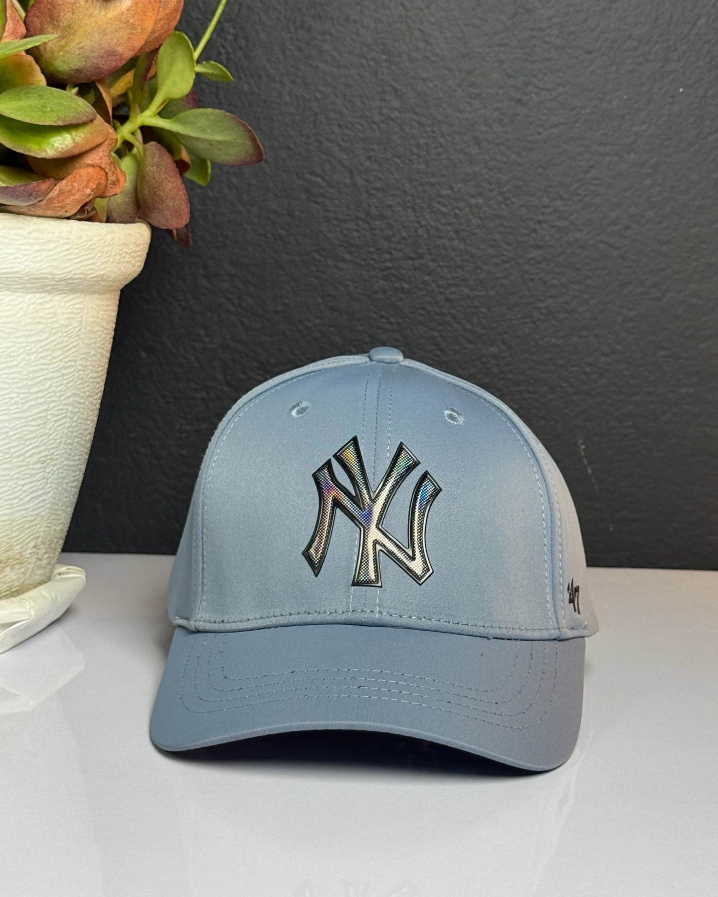 light blue baseball cap is a New Era 9FORTY New York Yankees adjustable strapback cap.