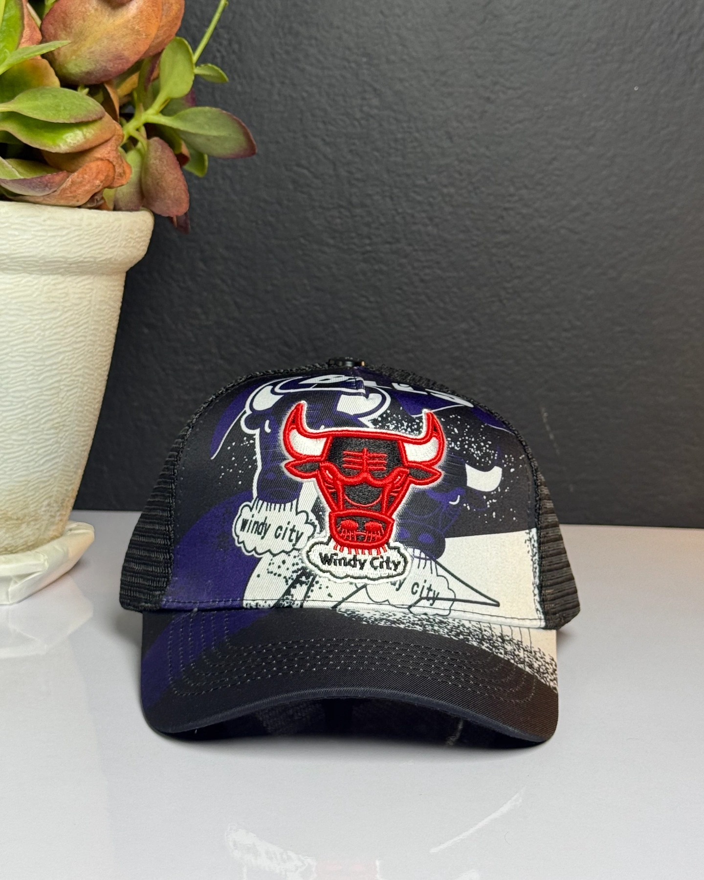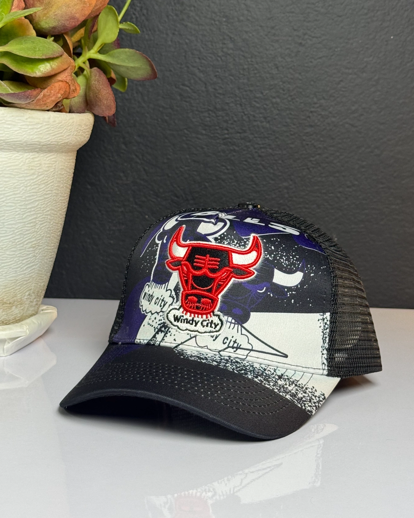 Mitchell & Ness Chicago Bulls Hyper Black Trucker cap featuring a vibrant graphic design and mesh backing.