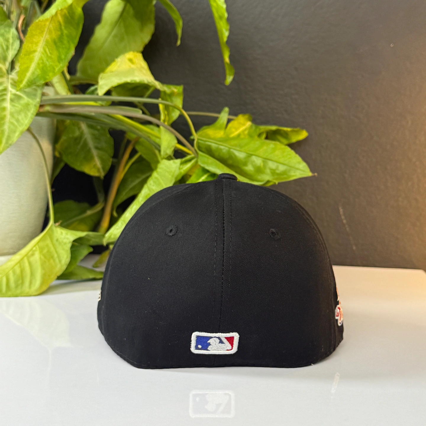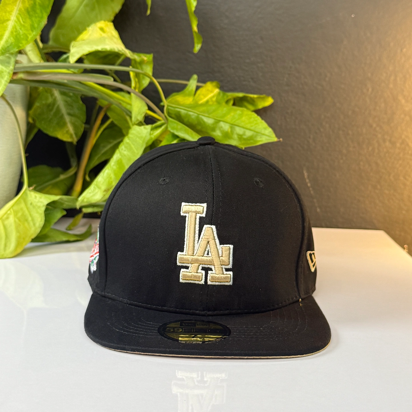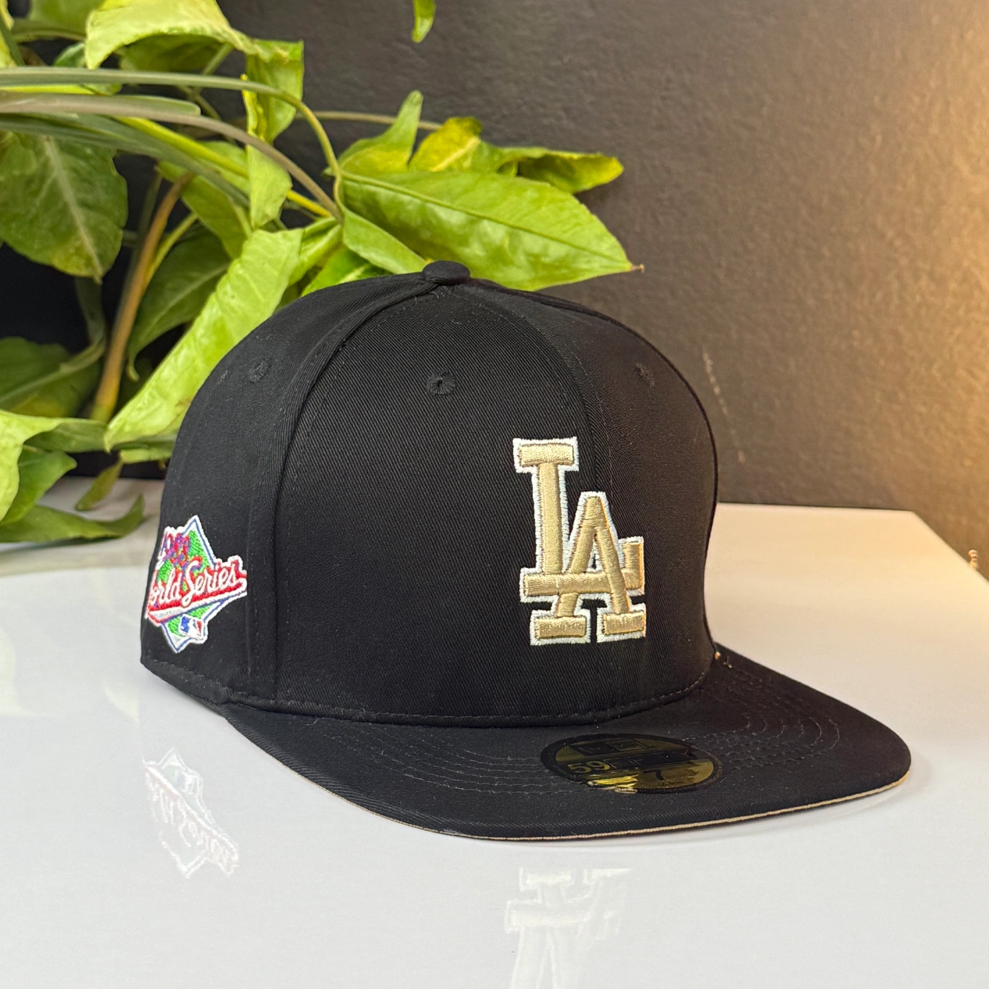 New Era 59FIFTY fitted hat, featuring a black crown and visor with a metallic gold Los Angeles Dodgers logo on the front and a World Series side patch.