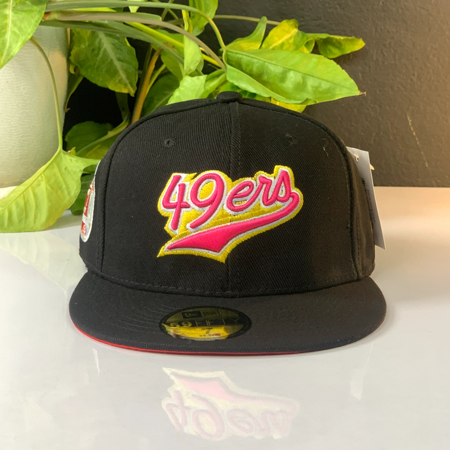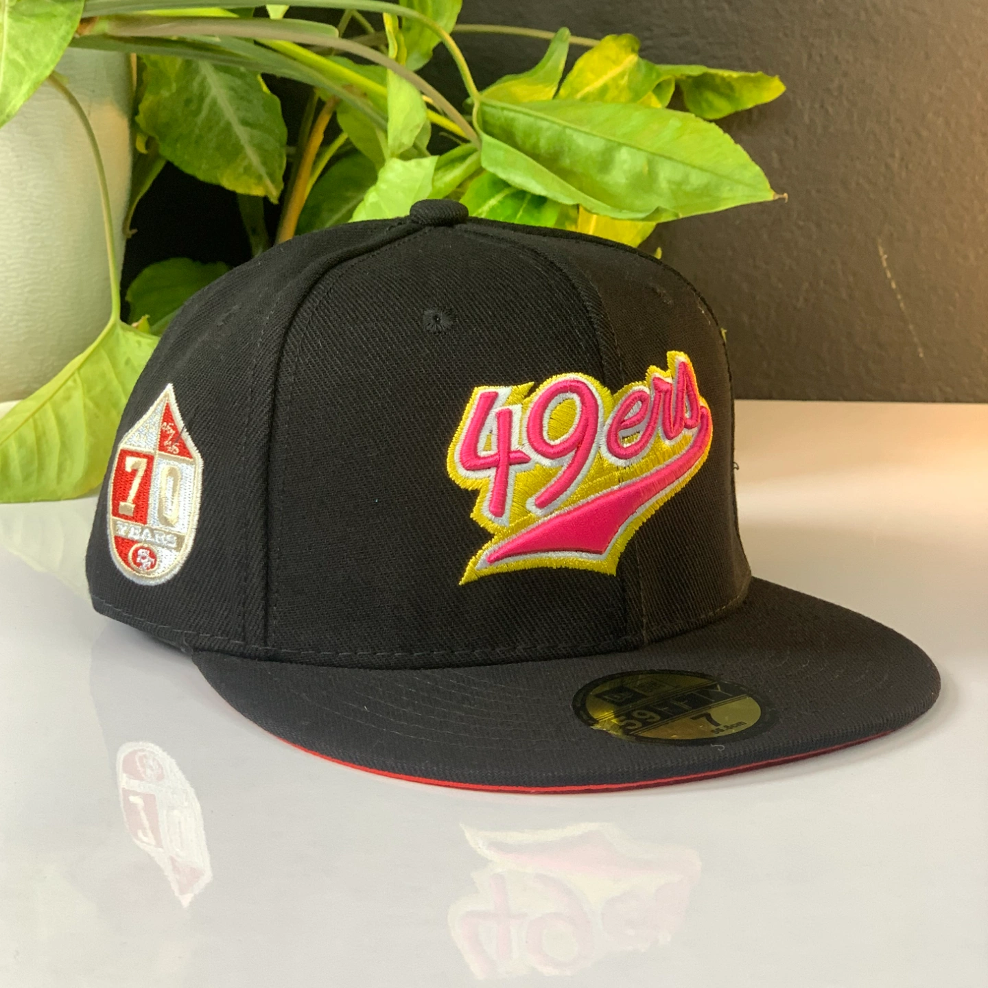 New Era 59FIFTY San Francisco 49ers fitted hat with a pink script logo and a "70 Years" side patch.