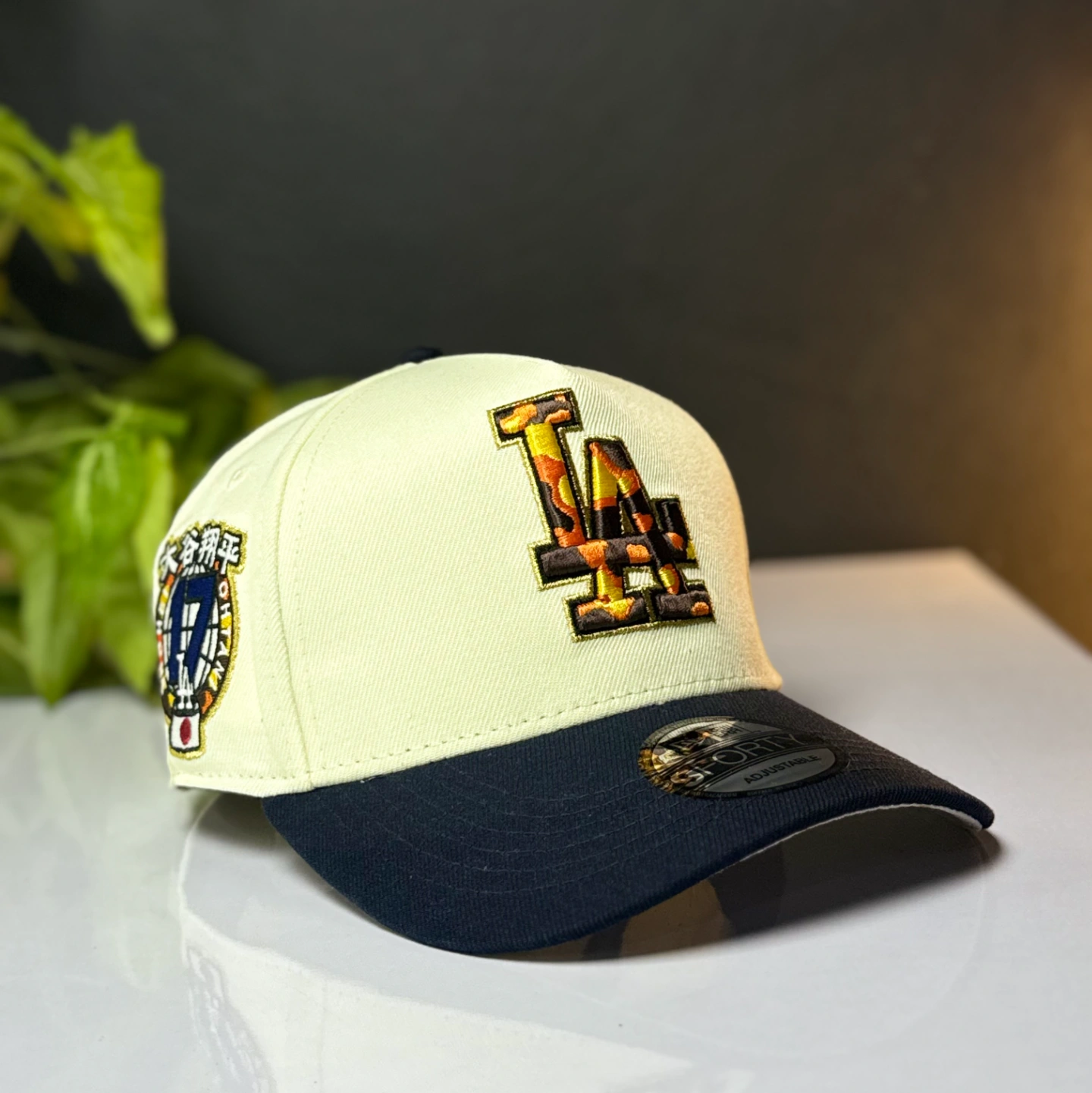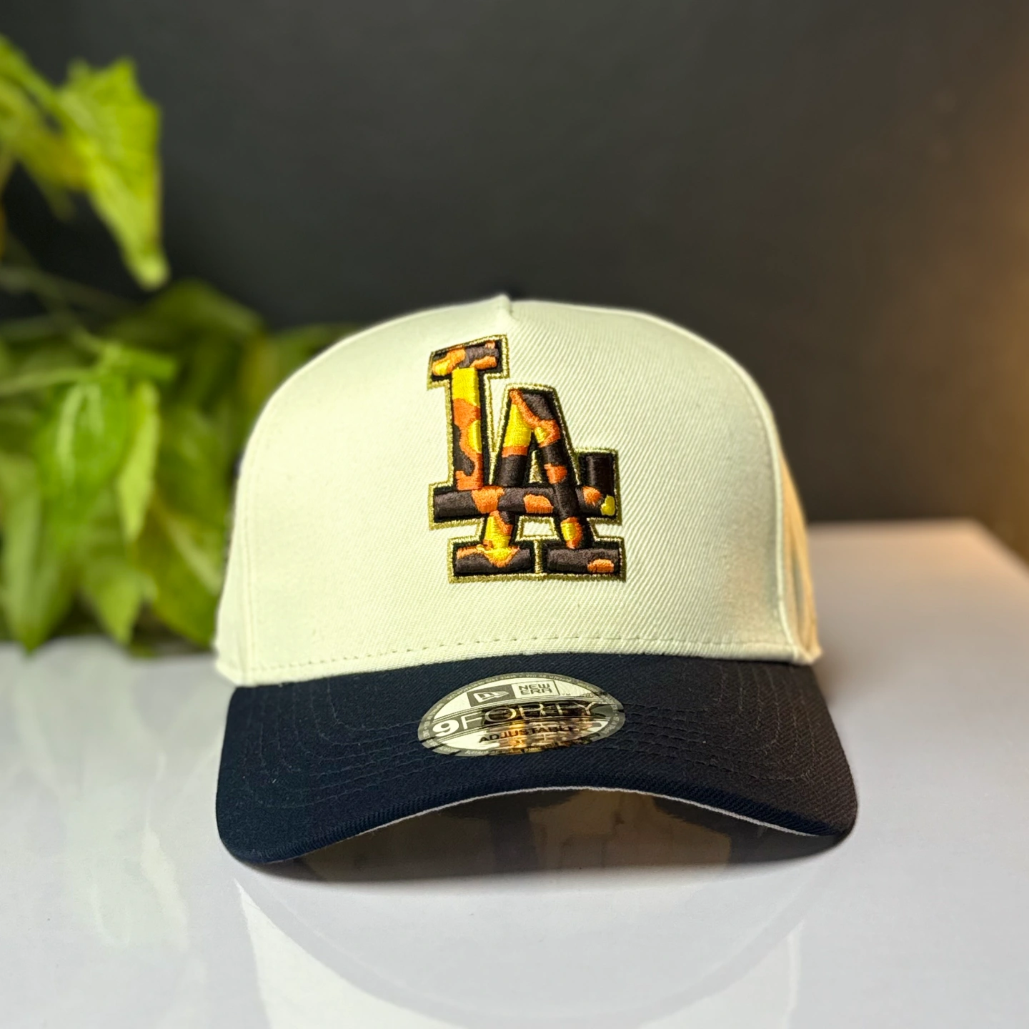 New Era 9FORTY A-Frame Los Angeles Dodgers snapback cap featuring an embroidered logo with a unique pattern on the front and a commemorative patch on the side.