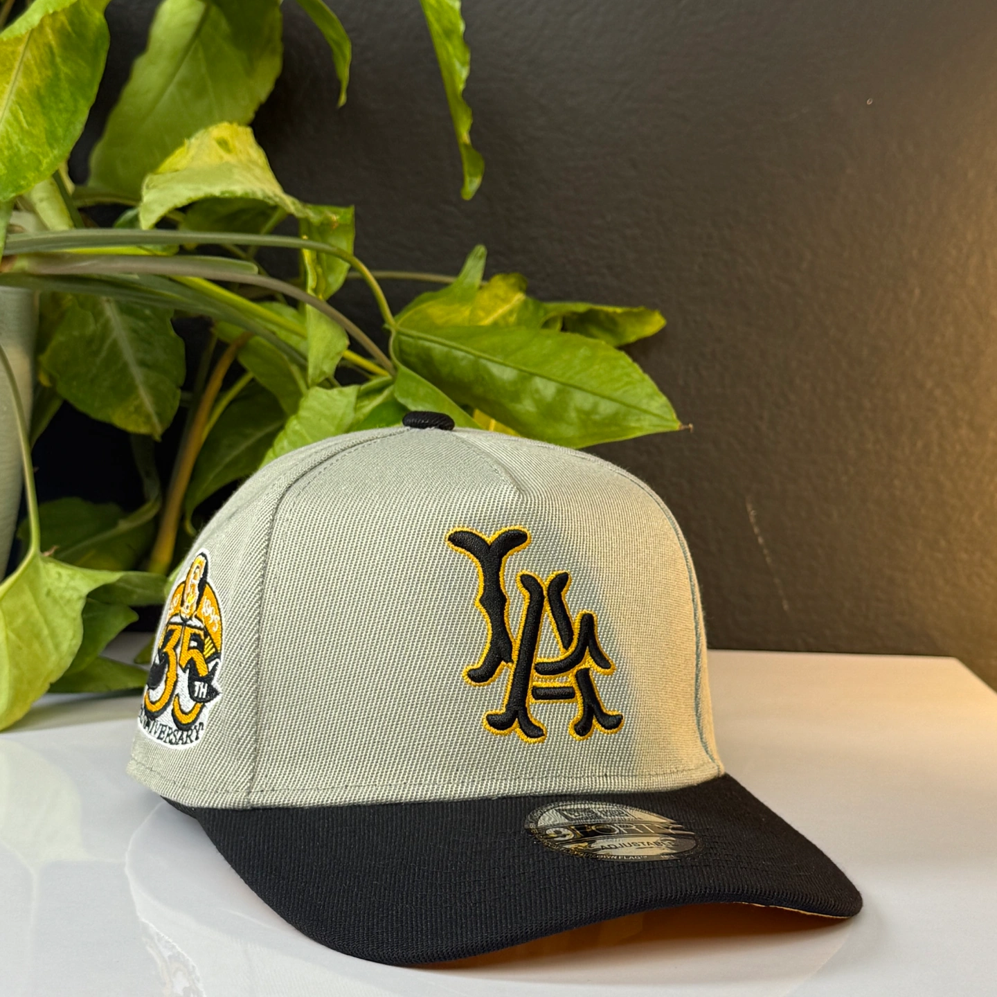 New Era 9FORTY Los Angeles Angels 35th Anniversary Two Tone cap in grey with a black visor and yellow under visor.