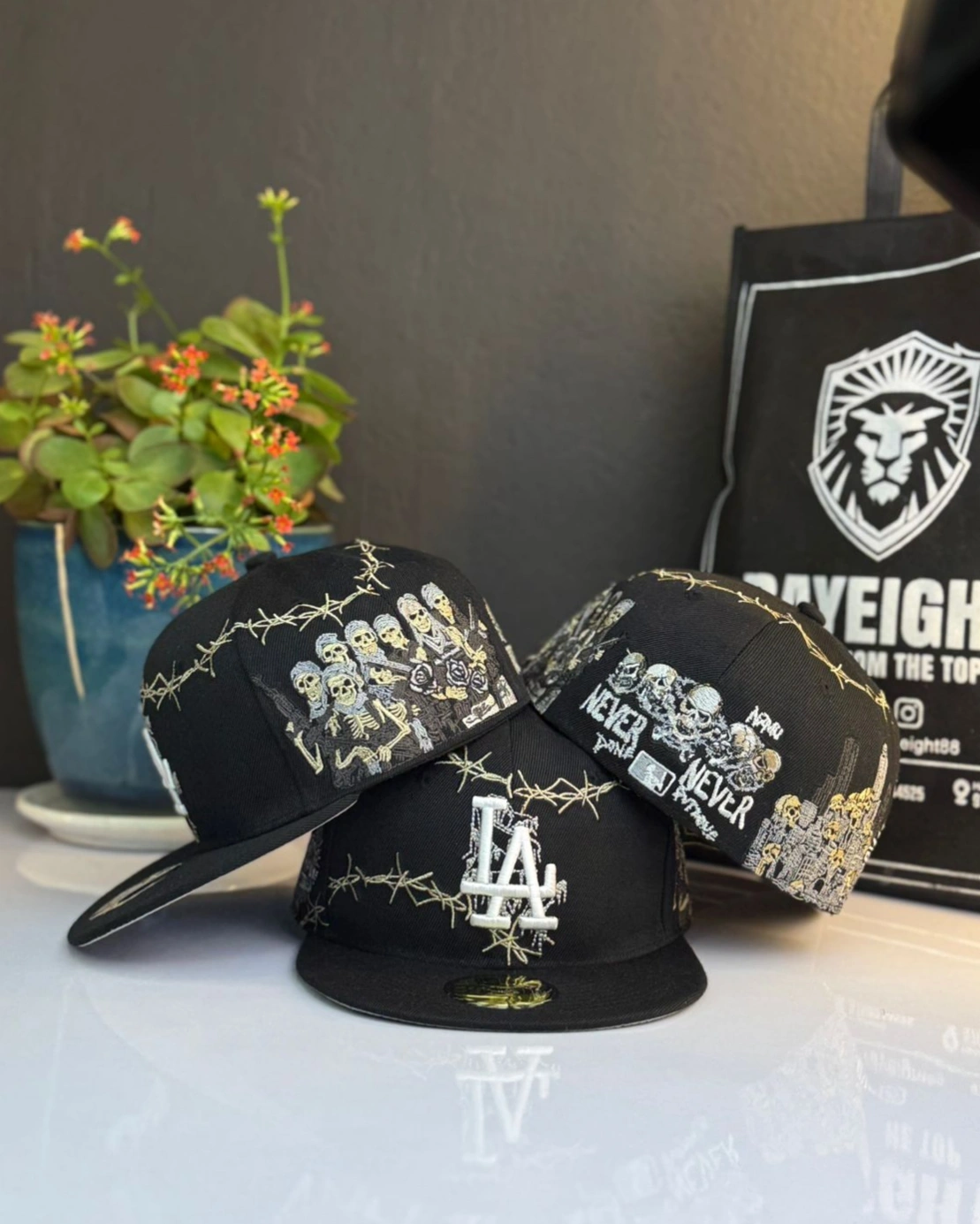 New Era LA Dodgers MLB Wire 59FIFTY fitted cap, featuring detailed barbed wire embroidery and a unique skeleton graphic.