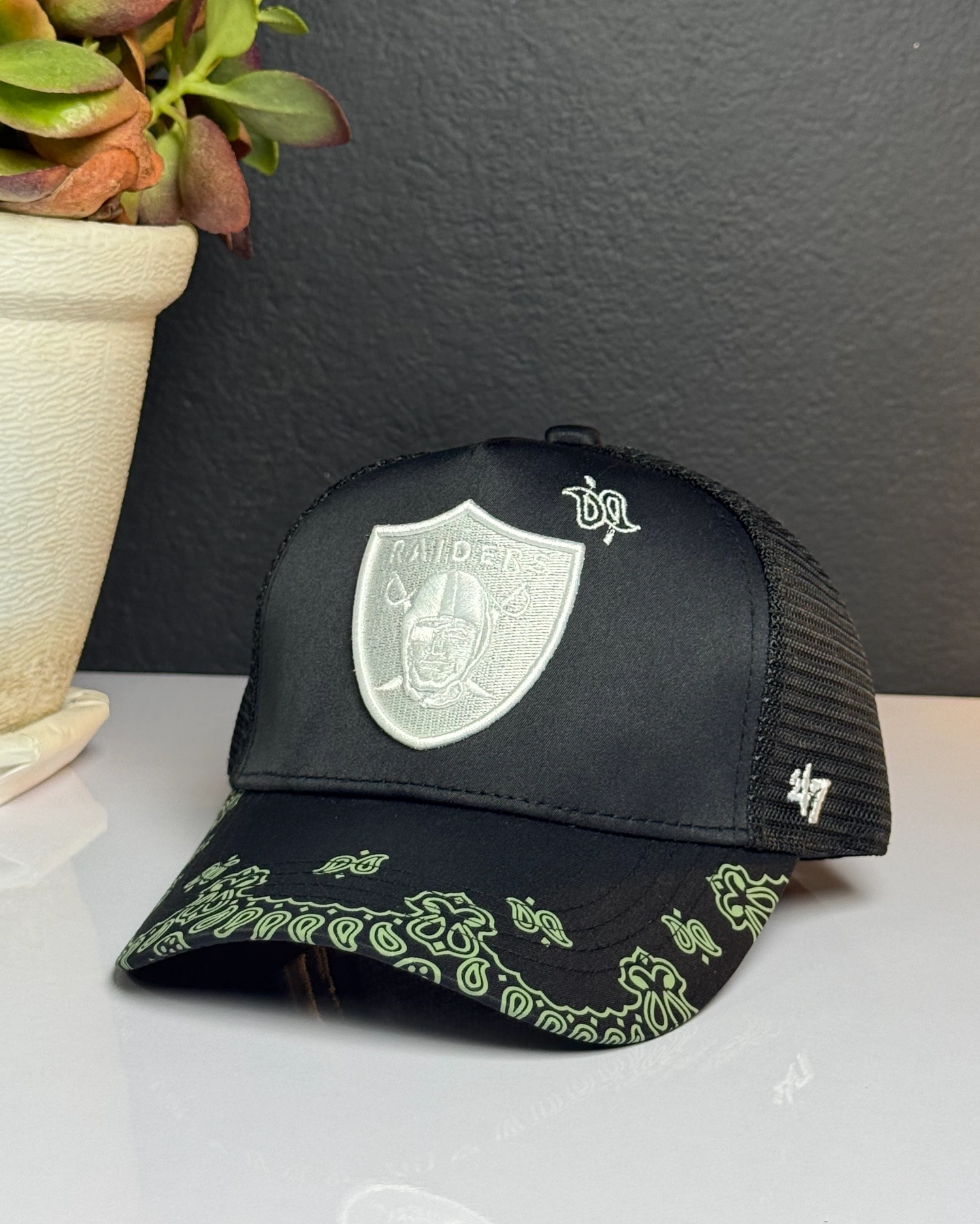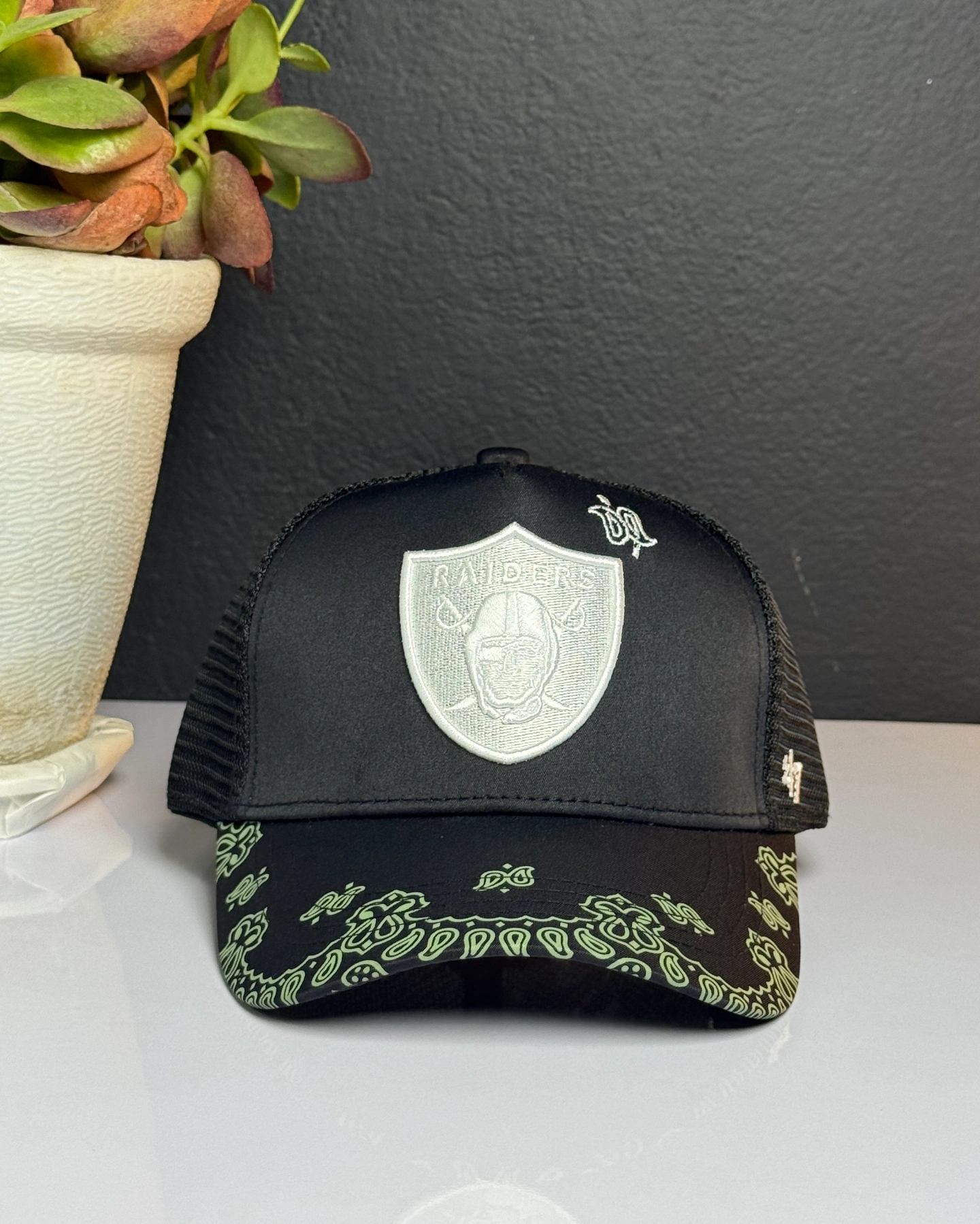 New Era Las Vegas Raiders "Paisley" 9FORTY A-Frame trucker snapback cap.