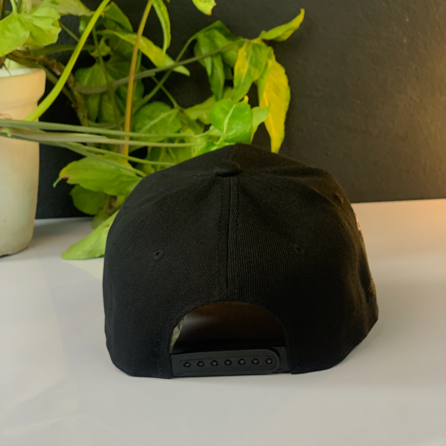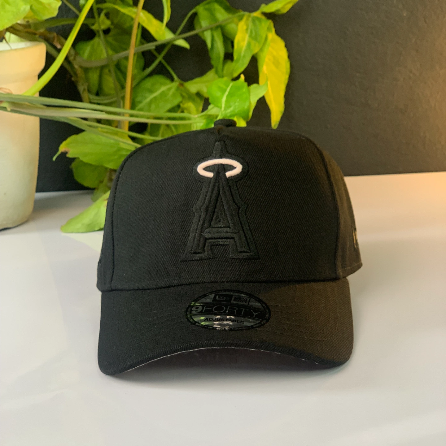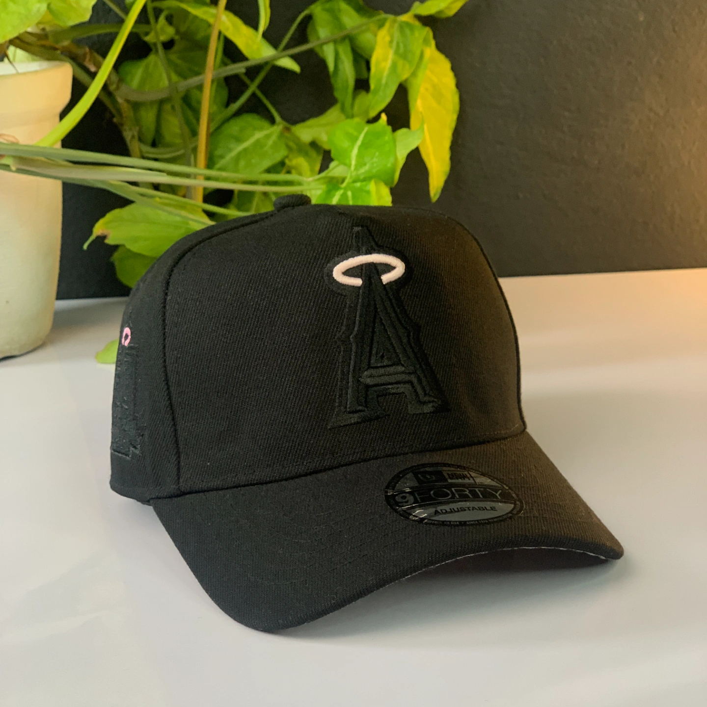 New Era Los Angeles Angels 9FORTY A-Frame snapback cap, featuring a black colorway with a pink underbrim and logo outline.