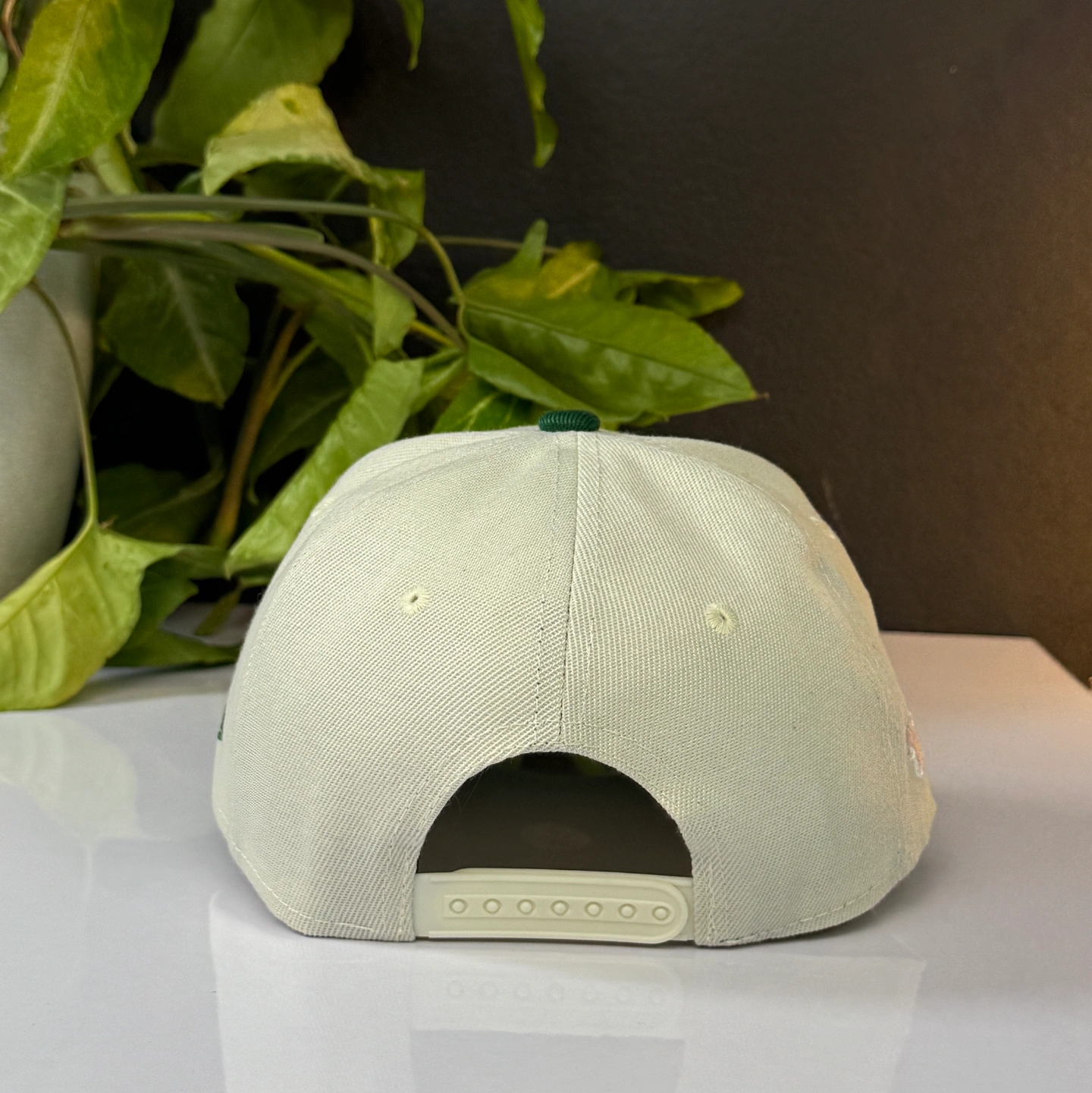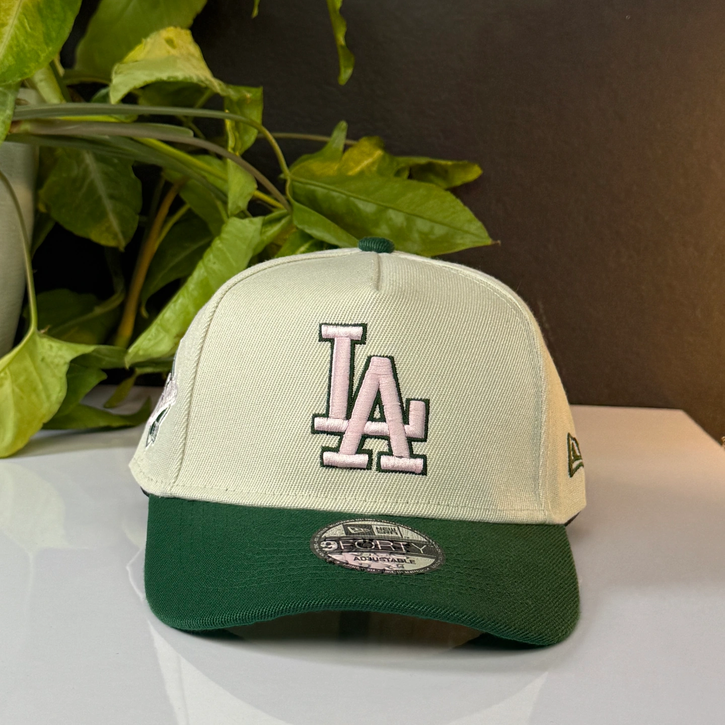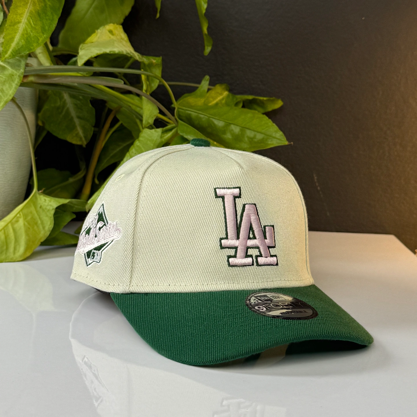 New Era Los Angeles Dodgers 9FORTY A-Frame snapback hat in a cream/off-white color with a green brim and pink logo accents