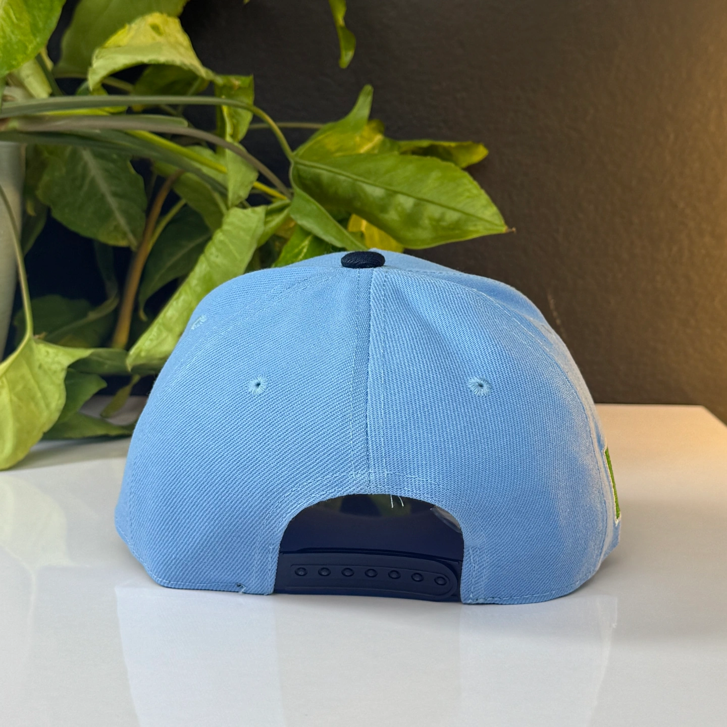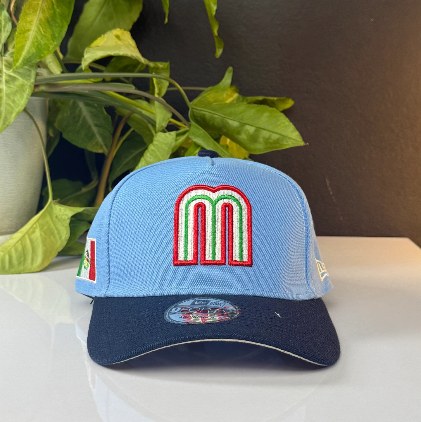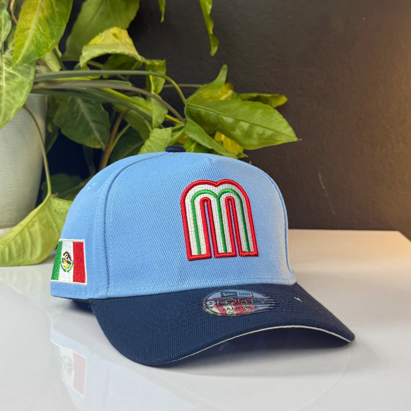 New Era Mexico National Baseball Team World Baseball Classic 9FORTY A-Frame snapback cap in light blue with a navy blue brim