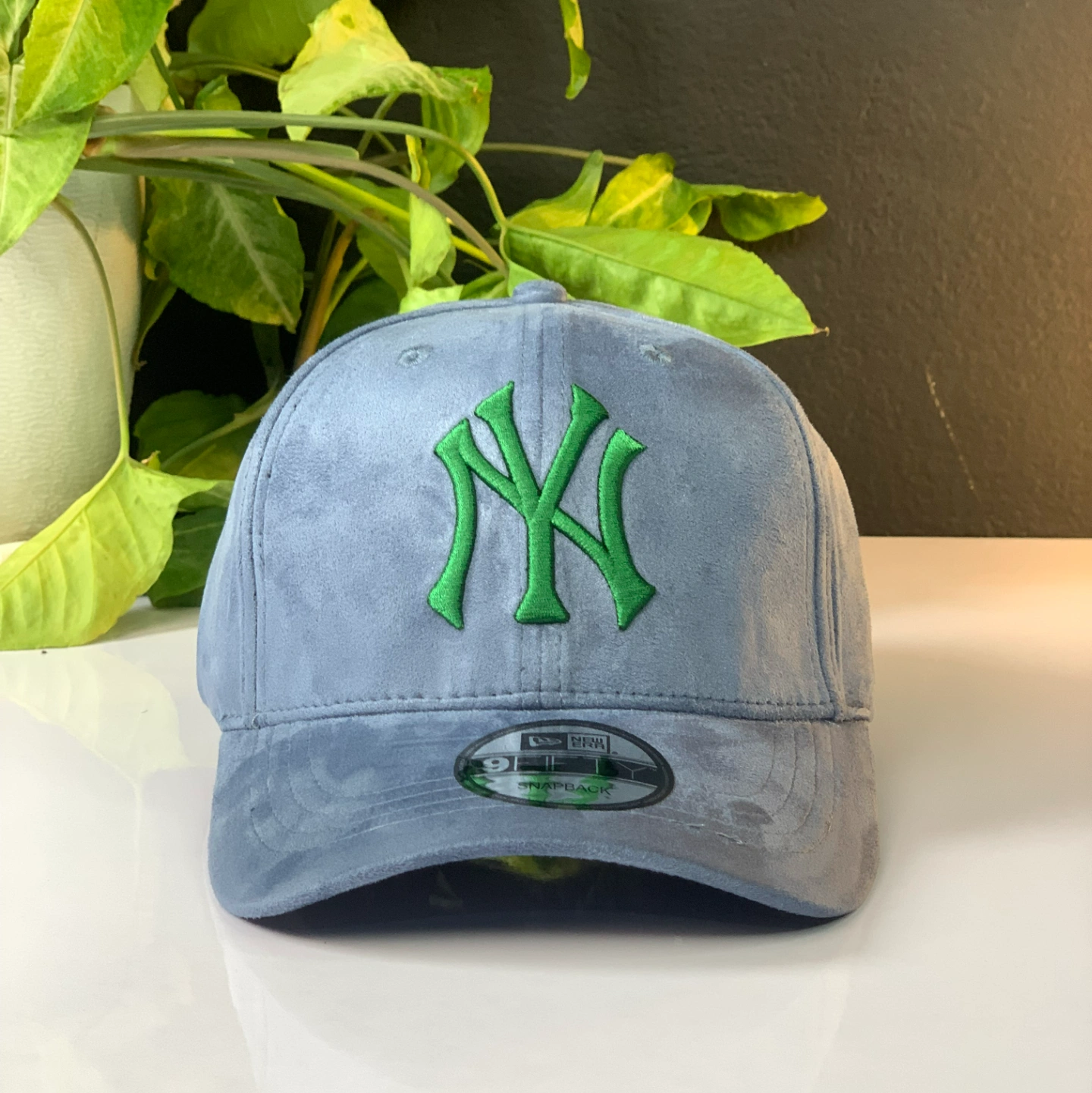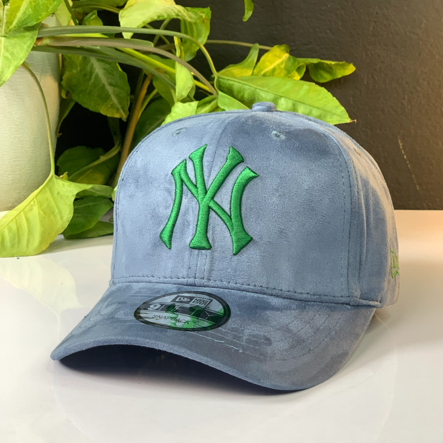 New Era New York Yankees League Essential 9FORTY adjustable cap in a grey suede material with a green logo.