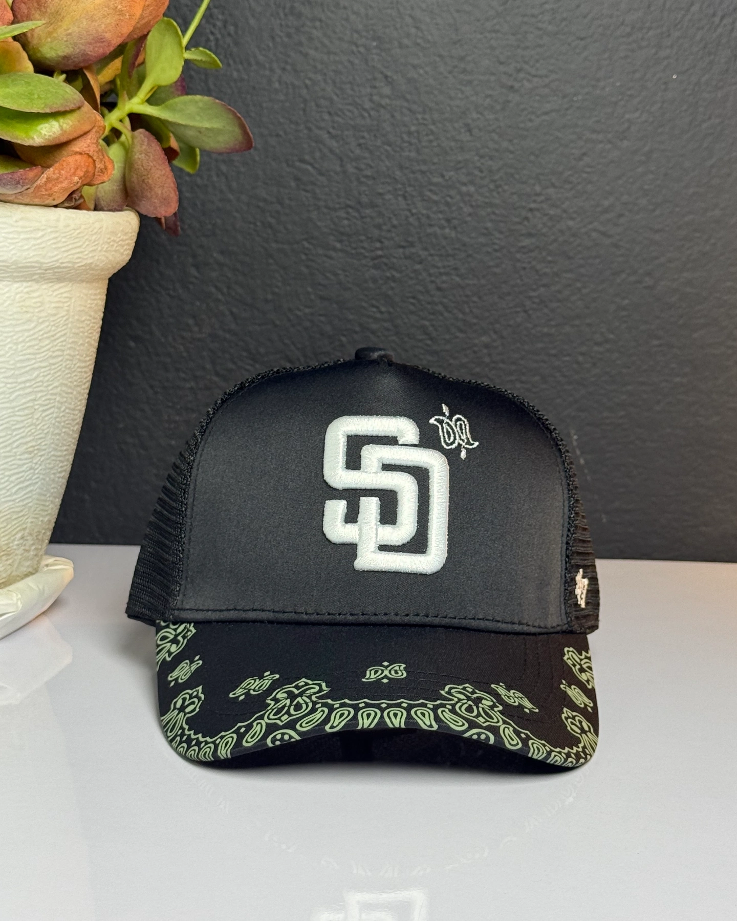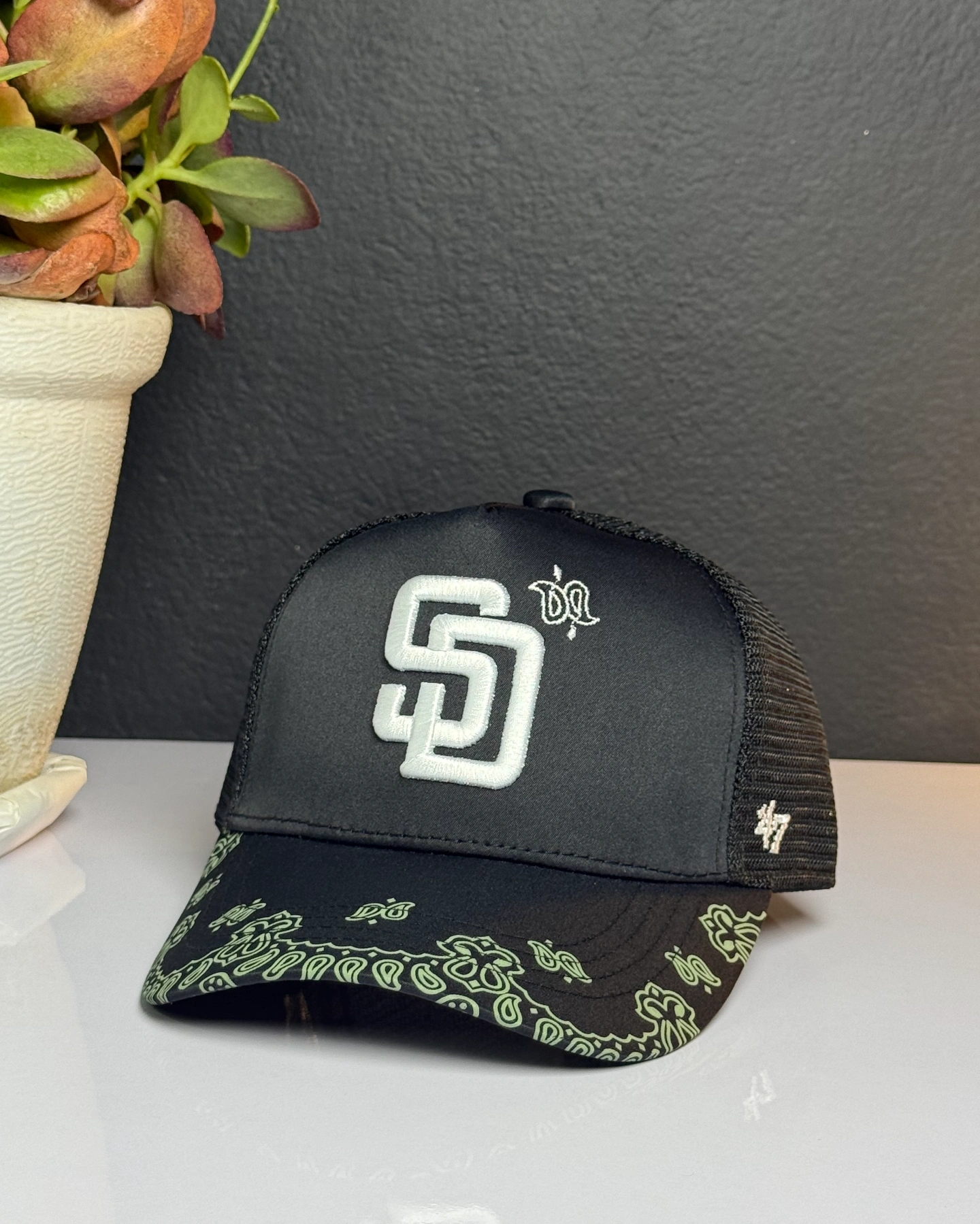 New Era San Diego Padres 9FORTY A-Frame Trucker Snapback hat featuring a black mesh design with a paisley print on the brim and a white embroidered team logo.