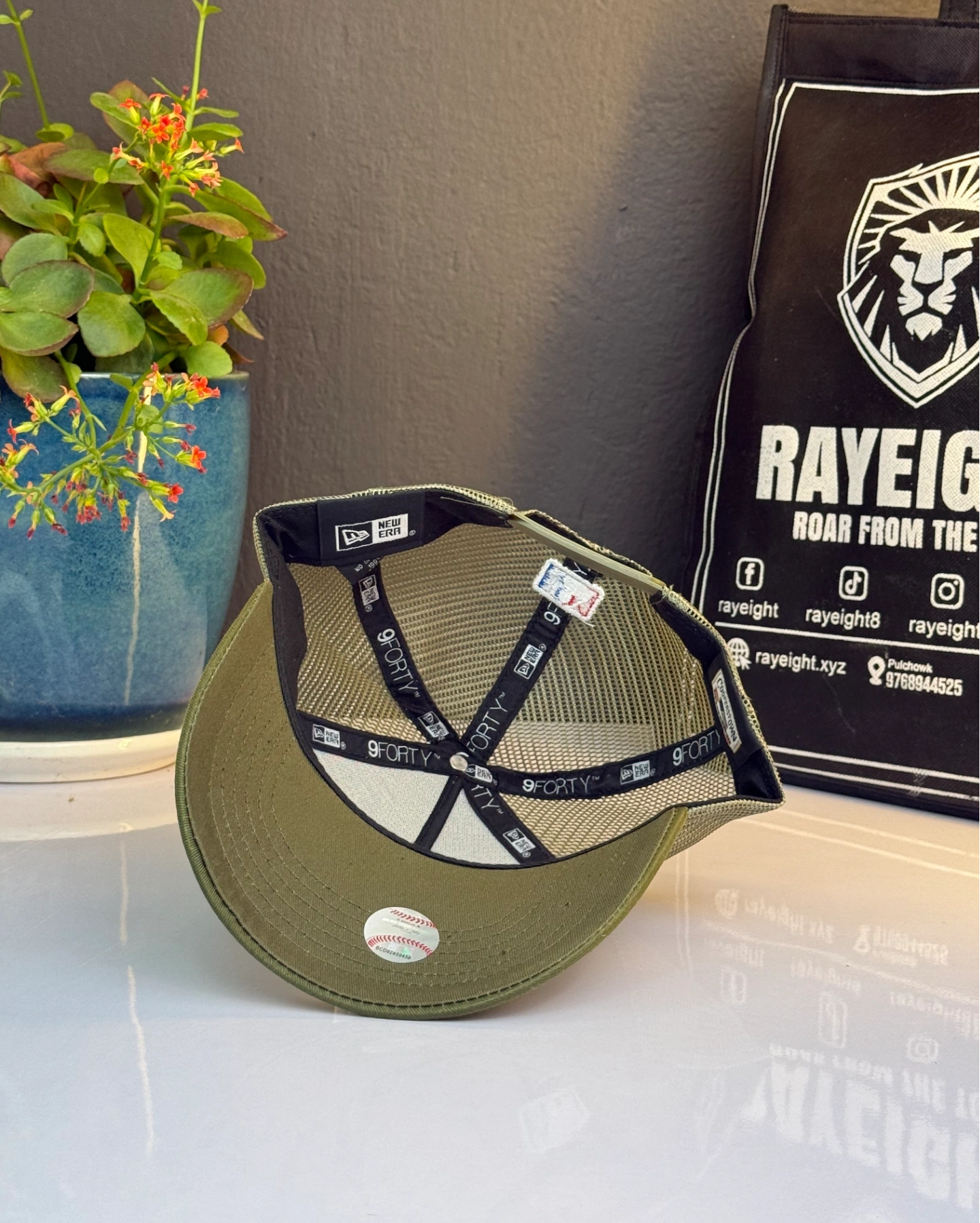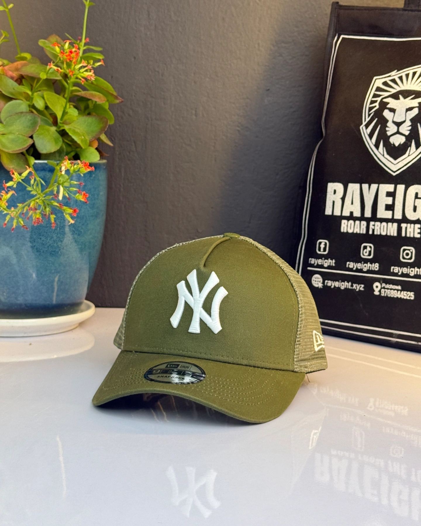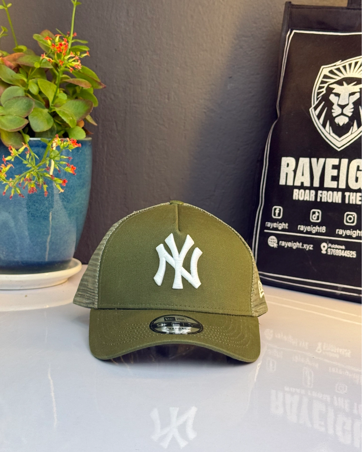 New York Yankees MLB Tonal Mesh A-Frame Adjustable Trucker Cap in an olive colo