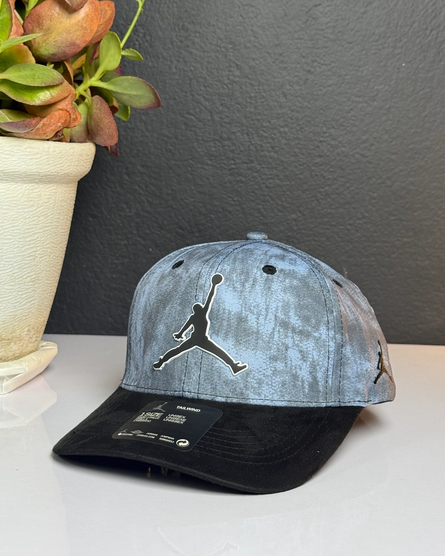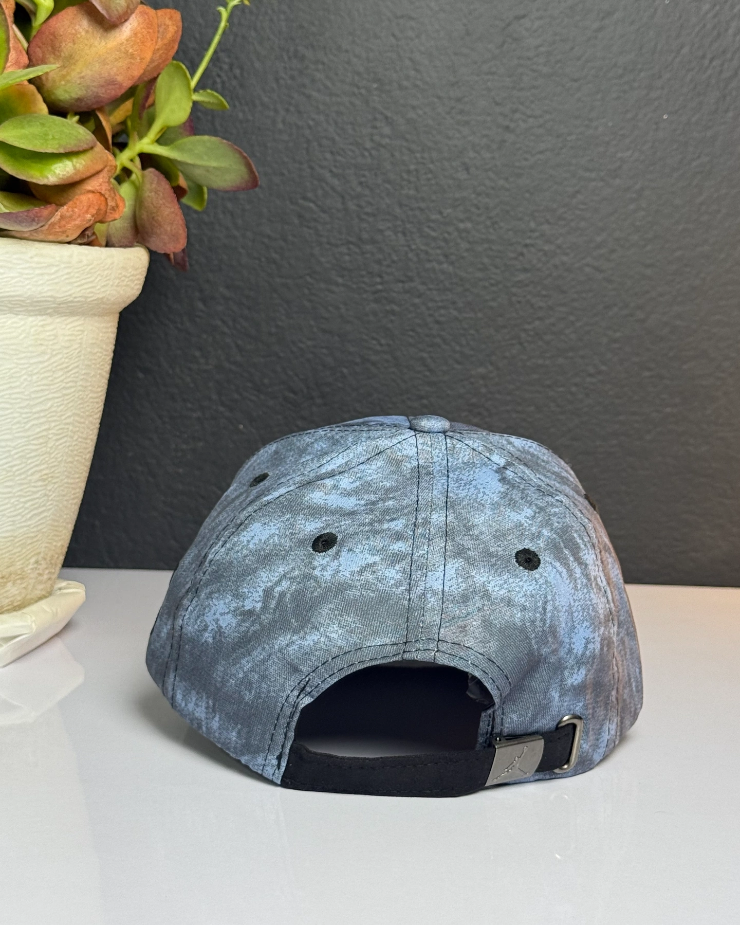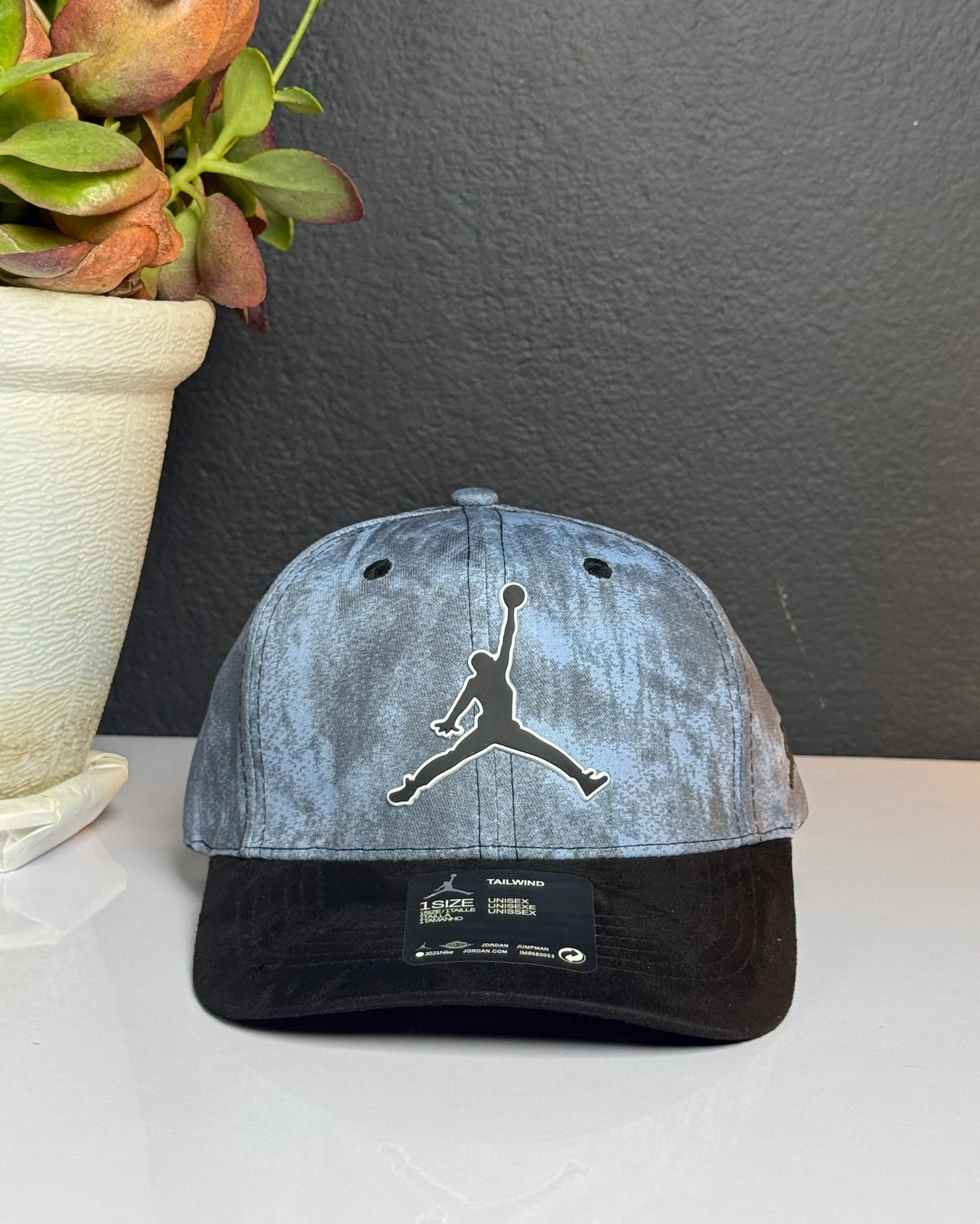Nike Air Jordan baseball cap featuring a blue and black tie-dye or marbled pattern and the signature Jumpman logo