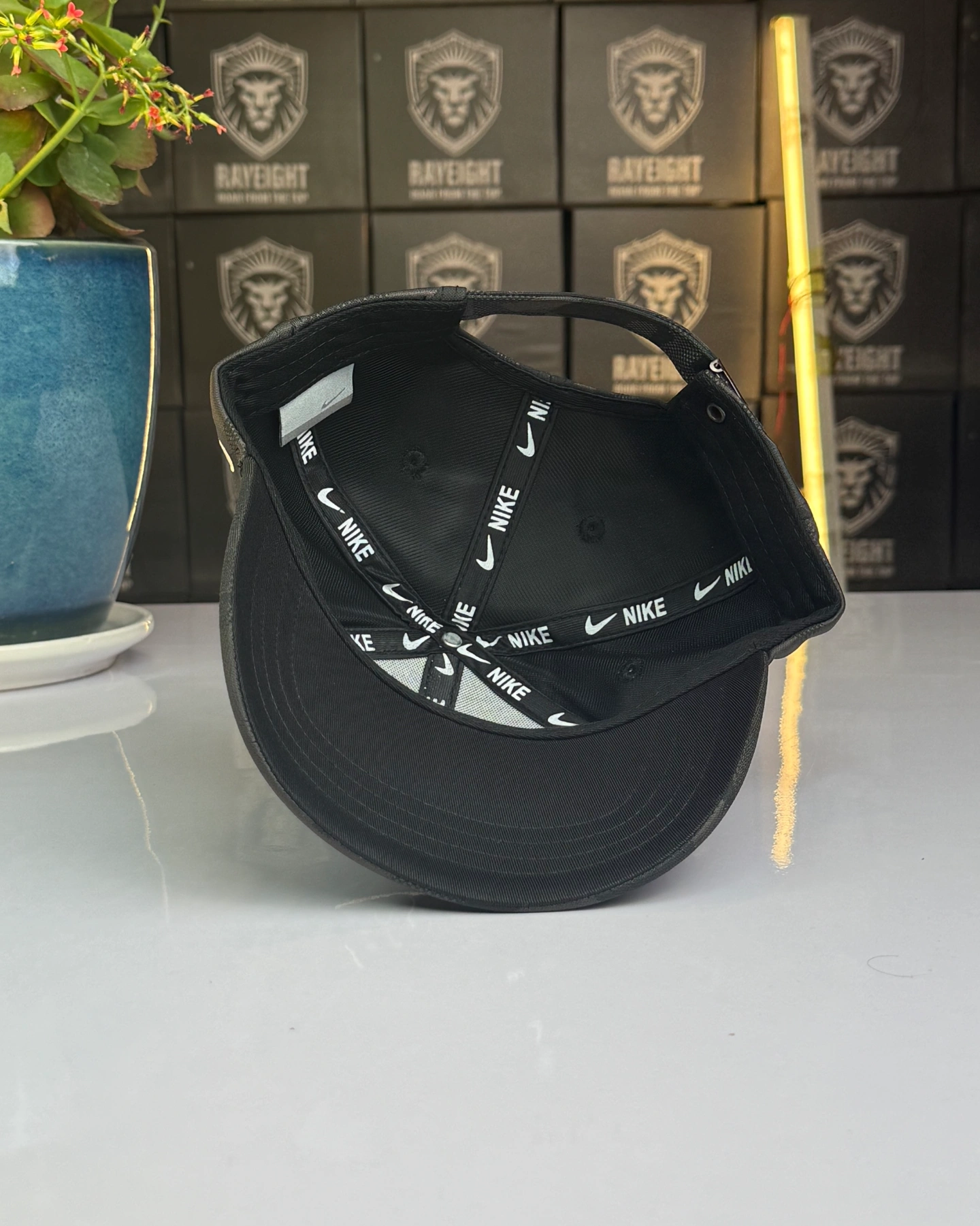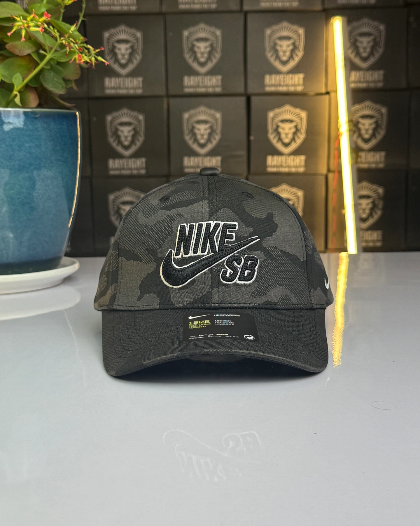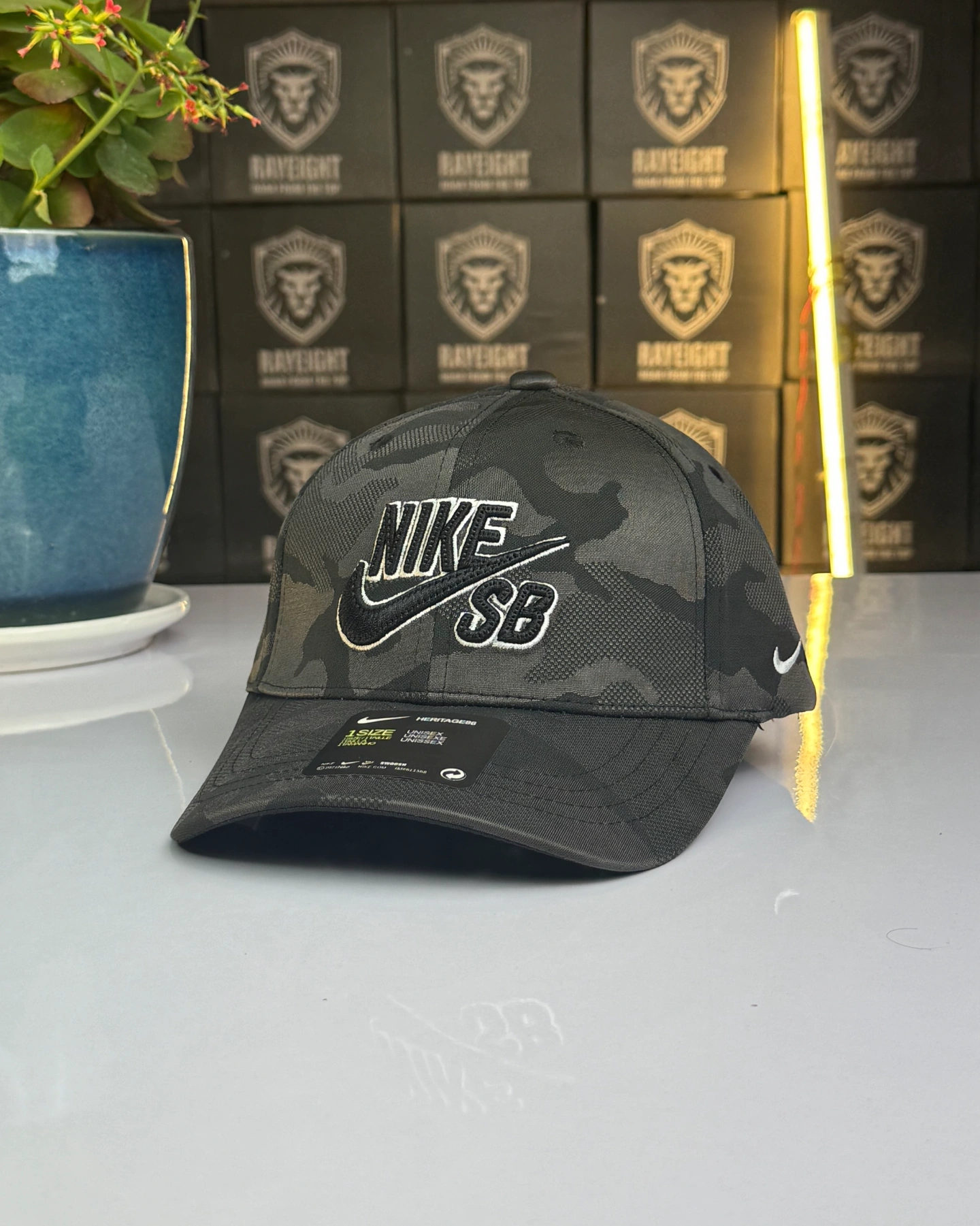 Nike SB camouflage snapback cap embroidered logos and skateboarding styling.