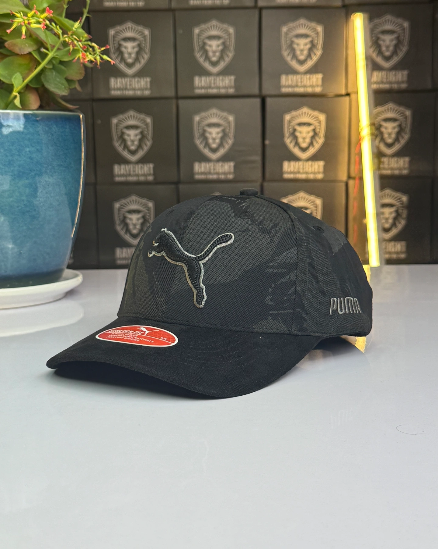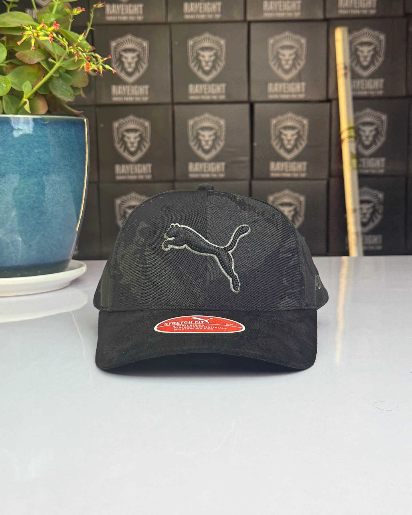 PUMA men's black camouflage cap features a stretch fit design with a prominent embroidered logo.