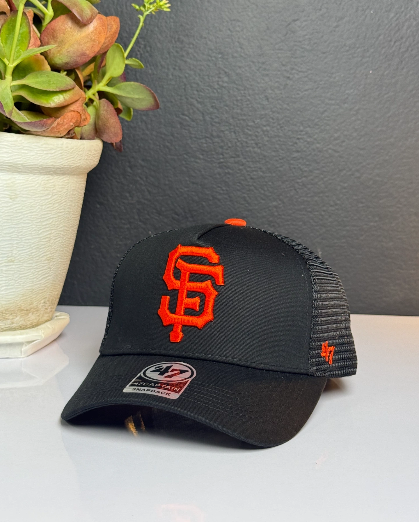San Francisco Giants '47 Brand Trucker Adjustable Hat featuring a black mesh design and a raised embroidery team logo on the front.