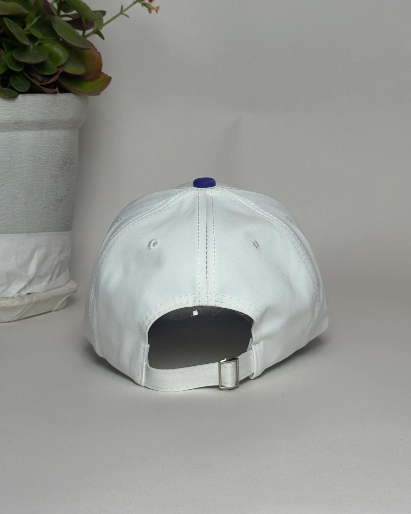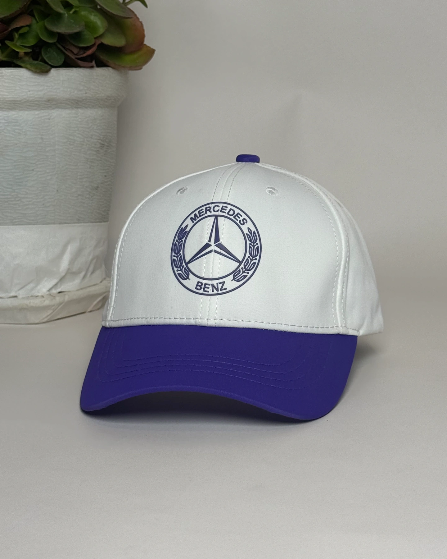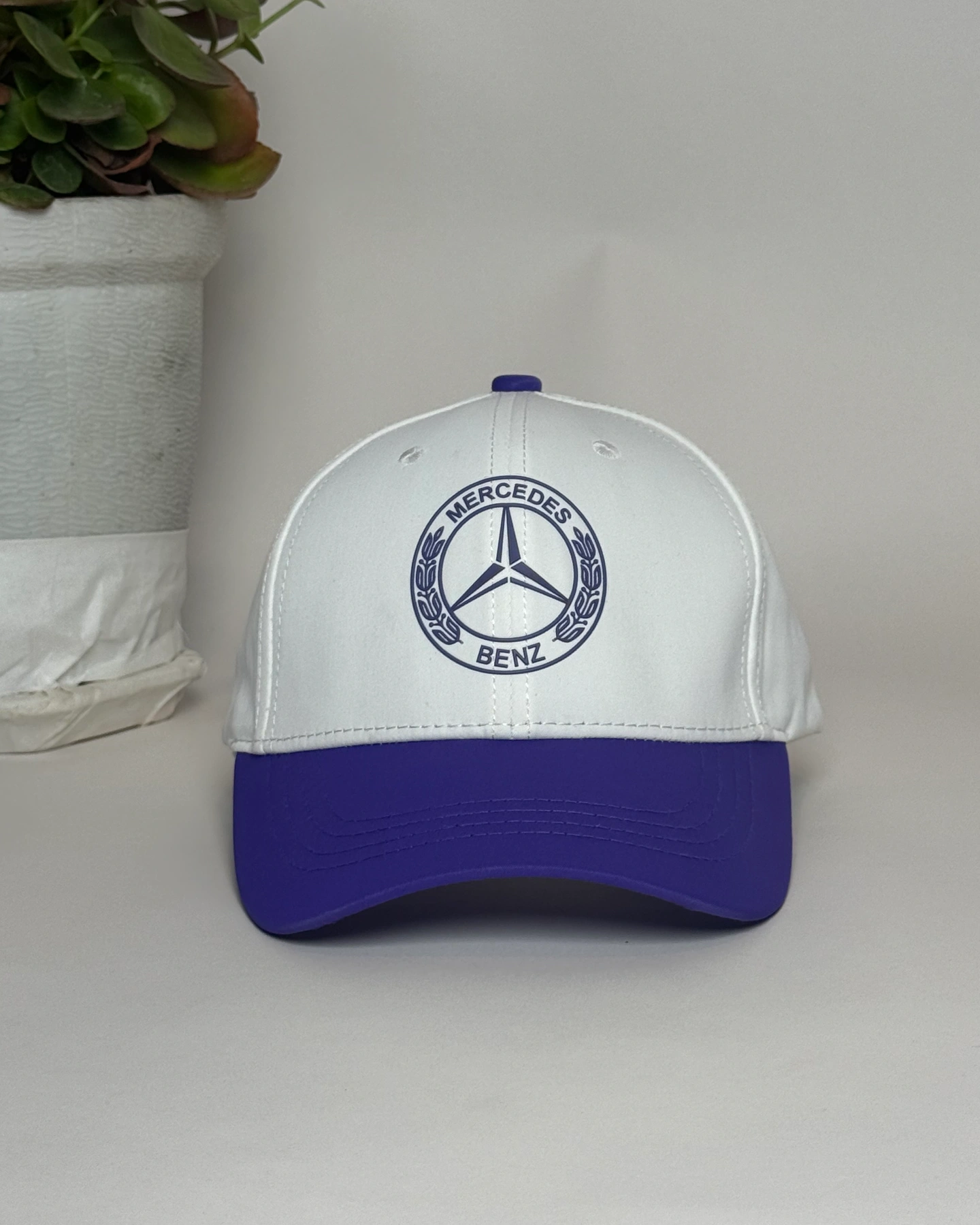 white and purple baseball cap featuring the Mercedes-Benz emblem.