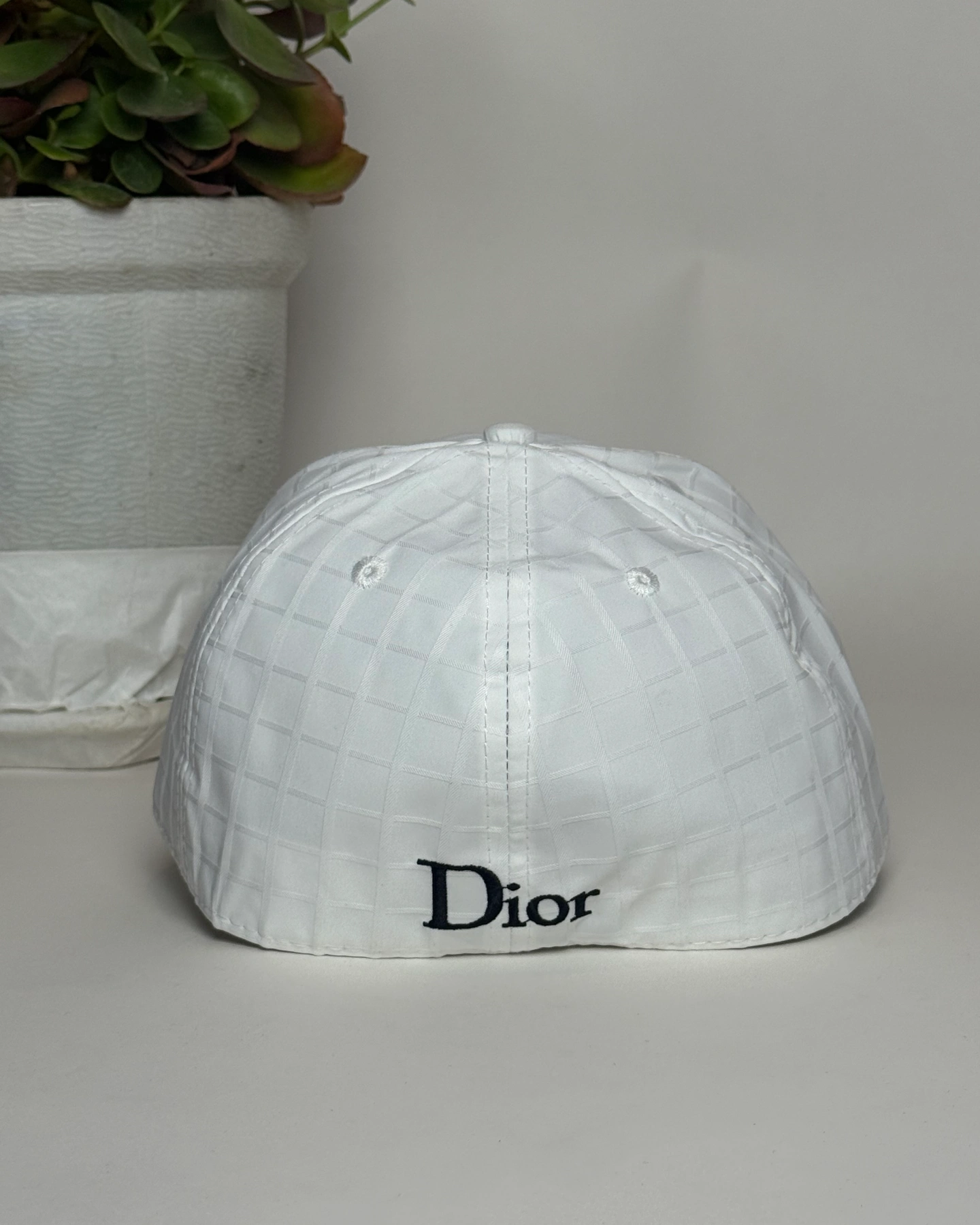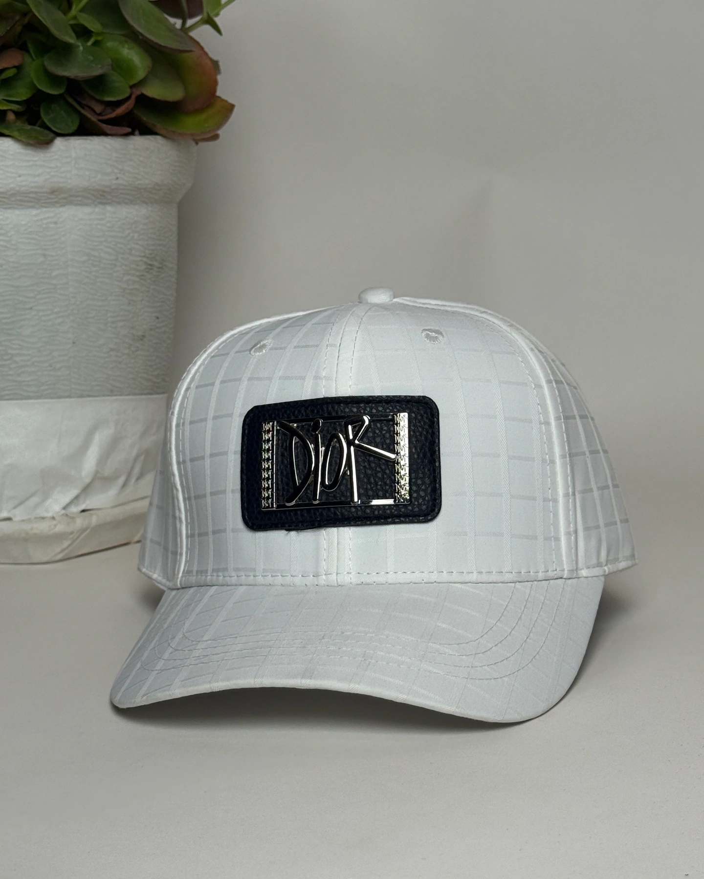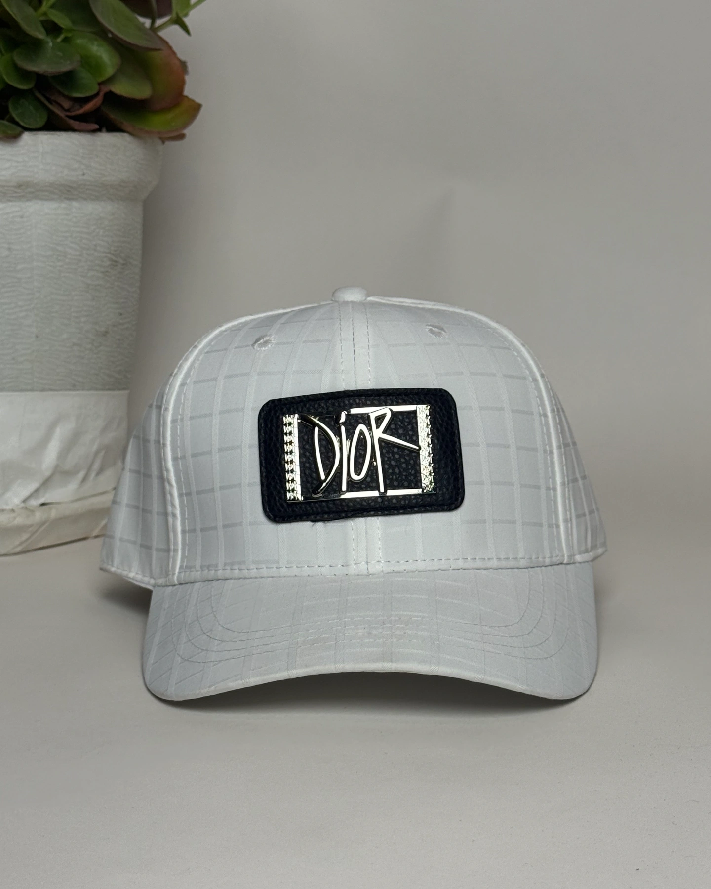 white baseball cap featuring a distinctive graphic patch on the front, similar in style to products from Dio